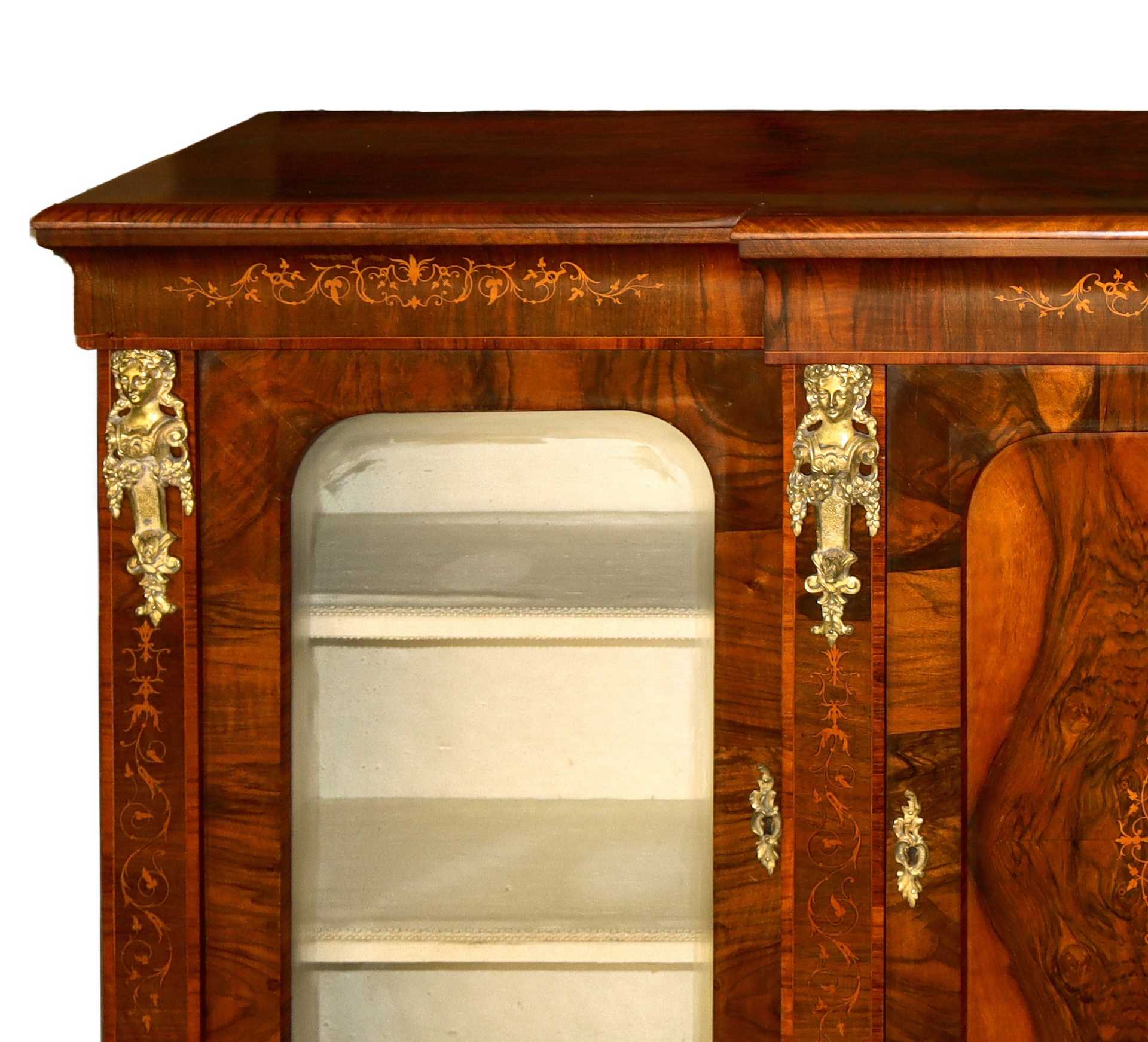 Etagere in radica con vetrine laterali e sportello centrale, intarsi al sottopiano, bronzi laterali applicati