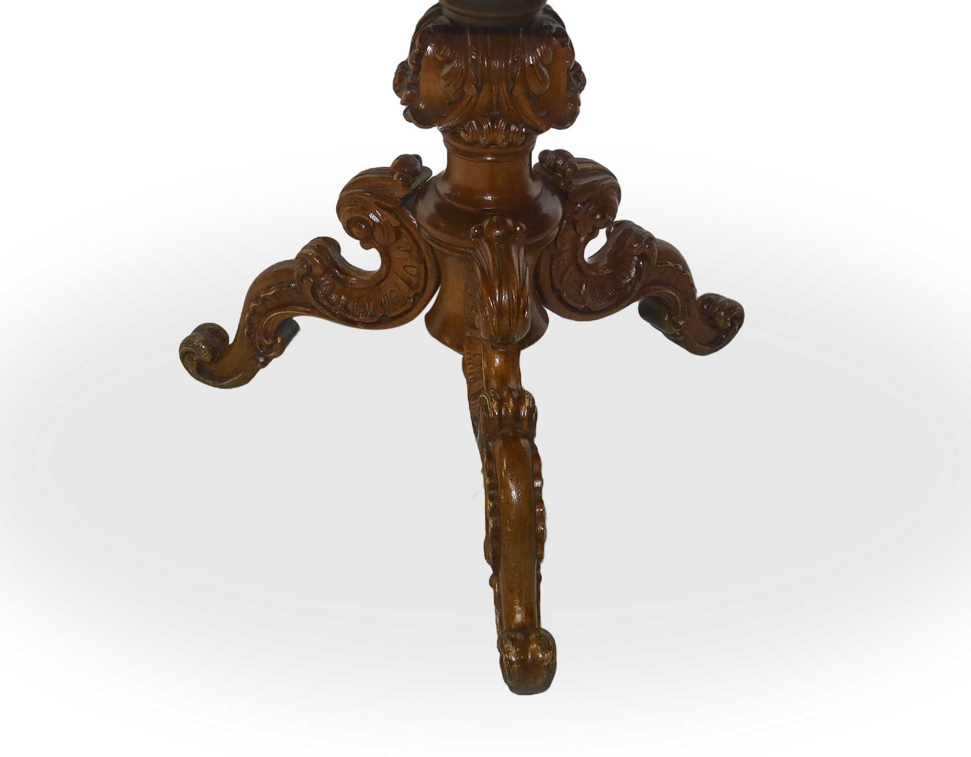 Tavolo rotondo in legno di noce piede a tre razze scolpito a foglie nello stile Luigi Filippo