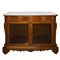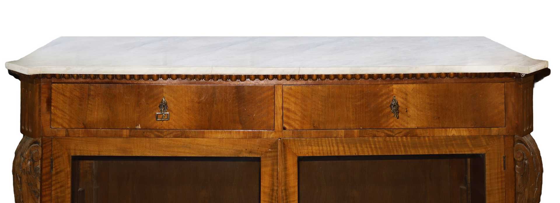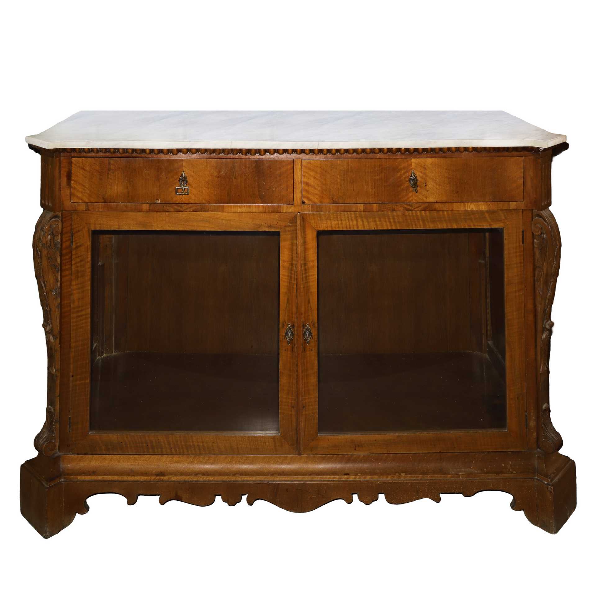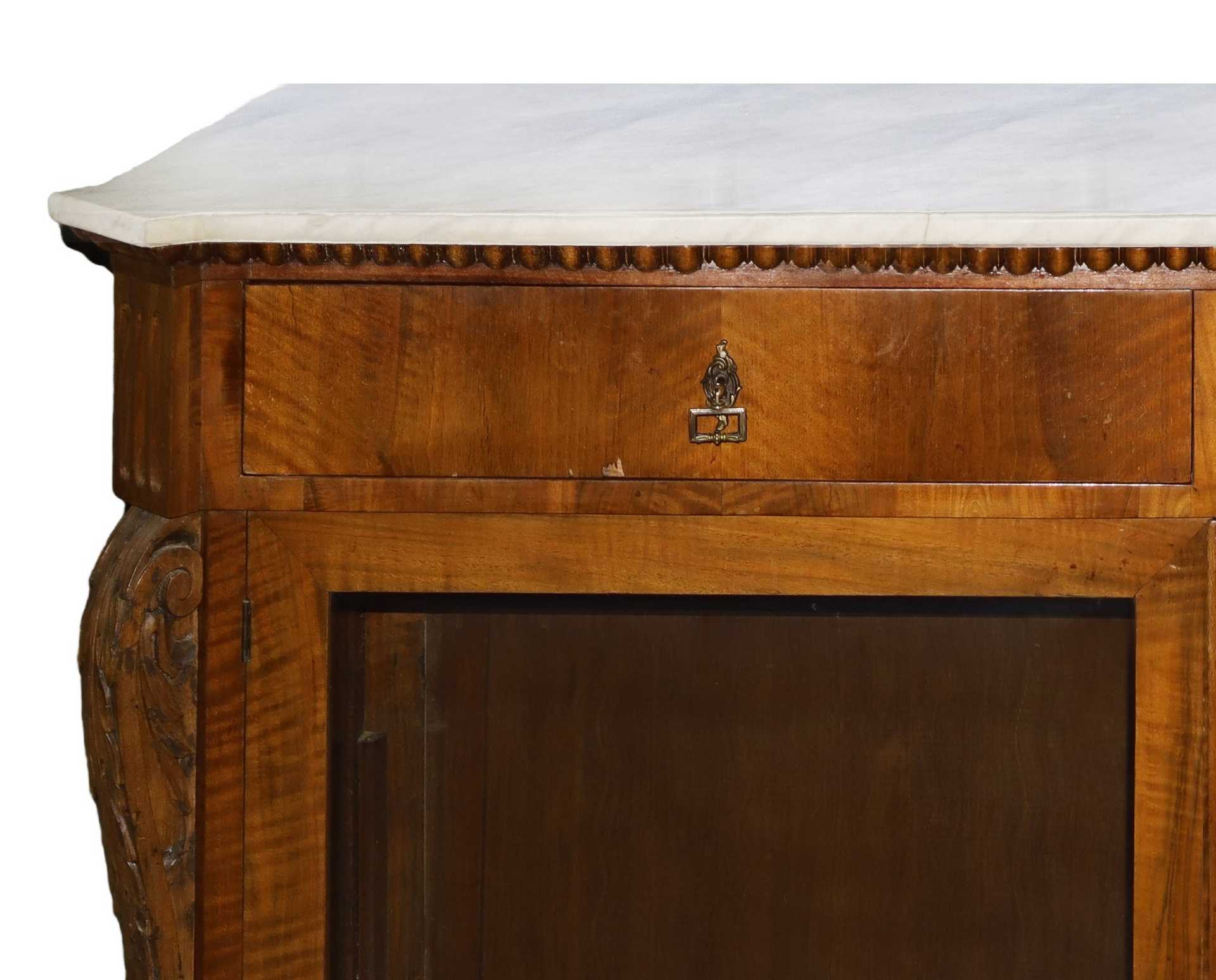 Credenza bassa in legno di noce marmo sagomato Carrara due cassetti sottopiano e due sportelli laterali con sculture intagliate di foglie d'acanto oblunghe mantovana bassa sagomata