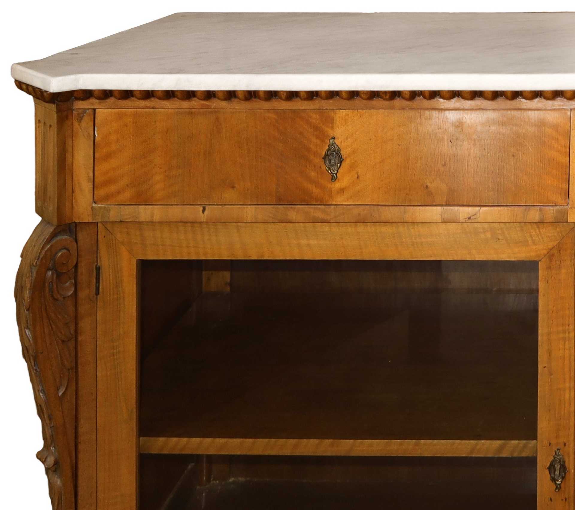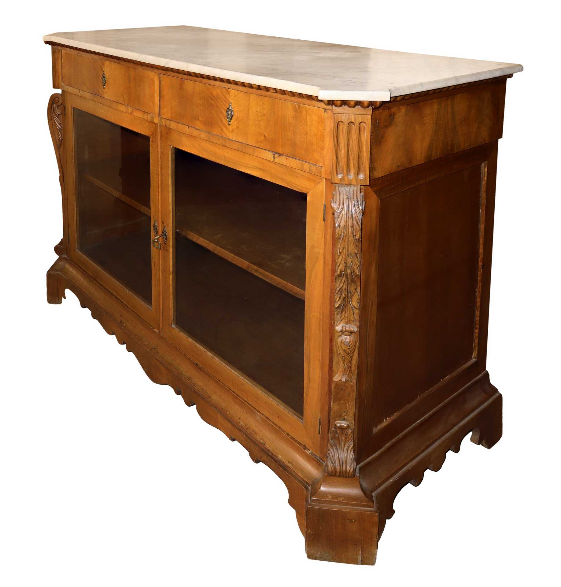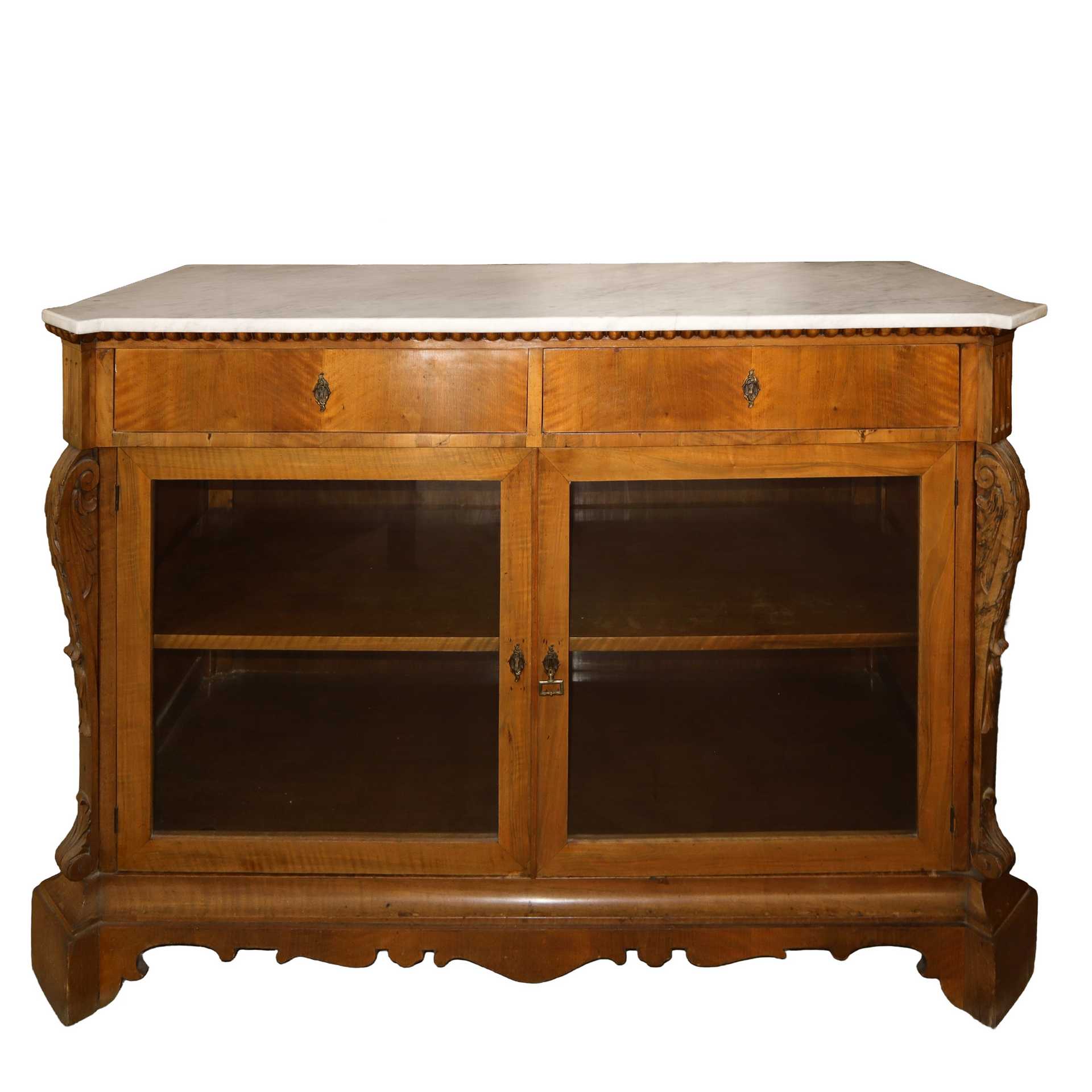Credenza bassa in legno di noce marmo sagomato Carrara due cassetti sottopianoe due sportelli laterali con sculture intagliate di foglie d'acanto oblunghe mantovana bassa sagomata