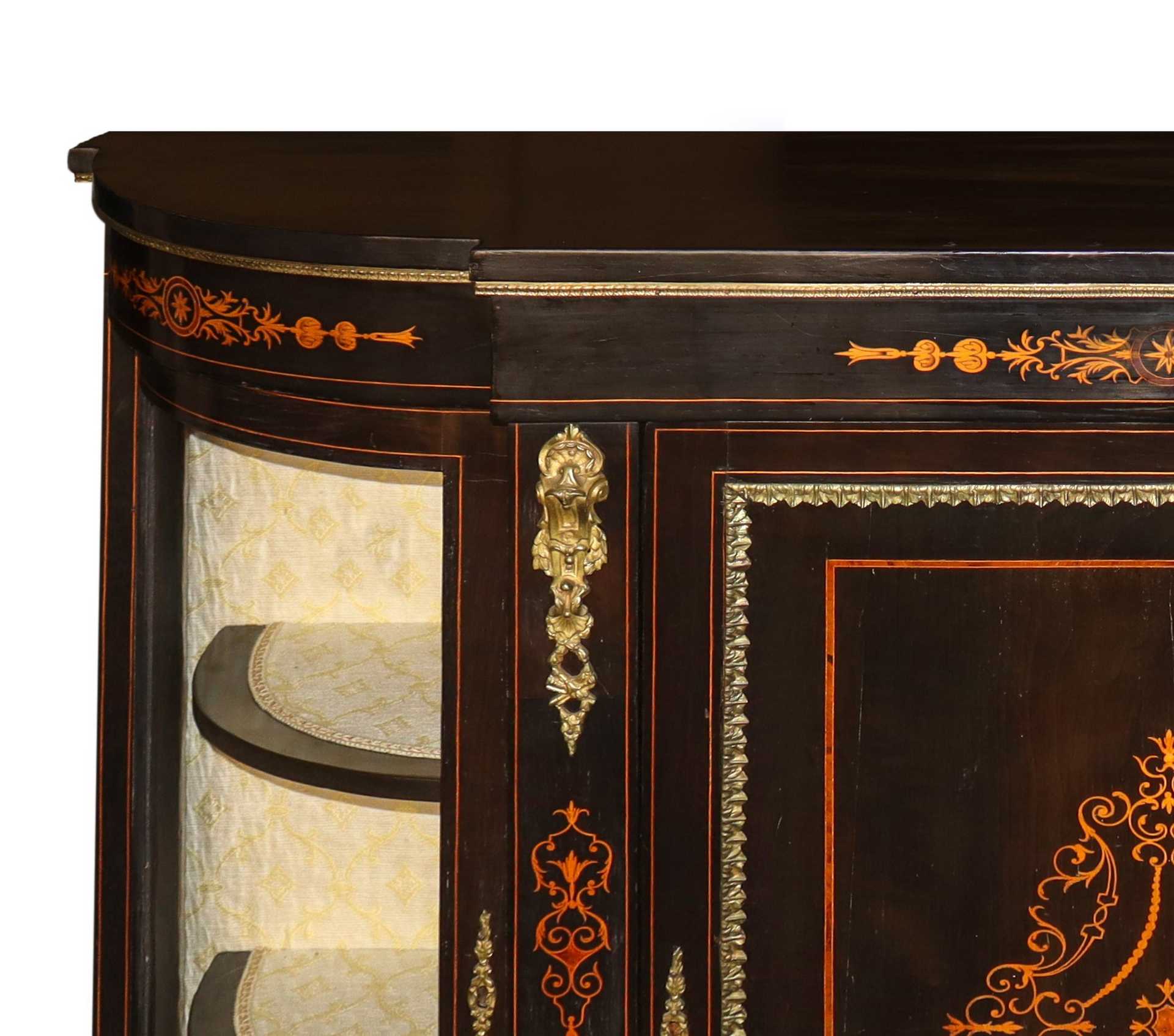 Etagere in legno nero ebanizzato e decori dorati con vetrine laterali in vetro