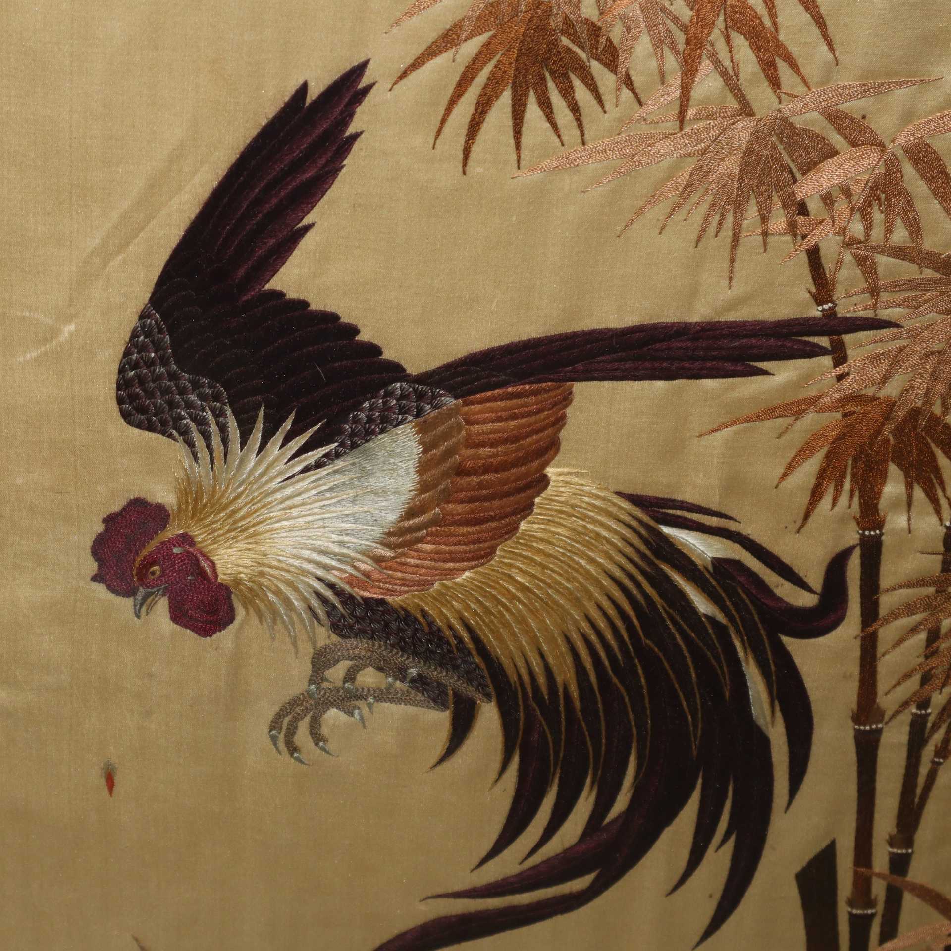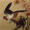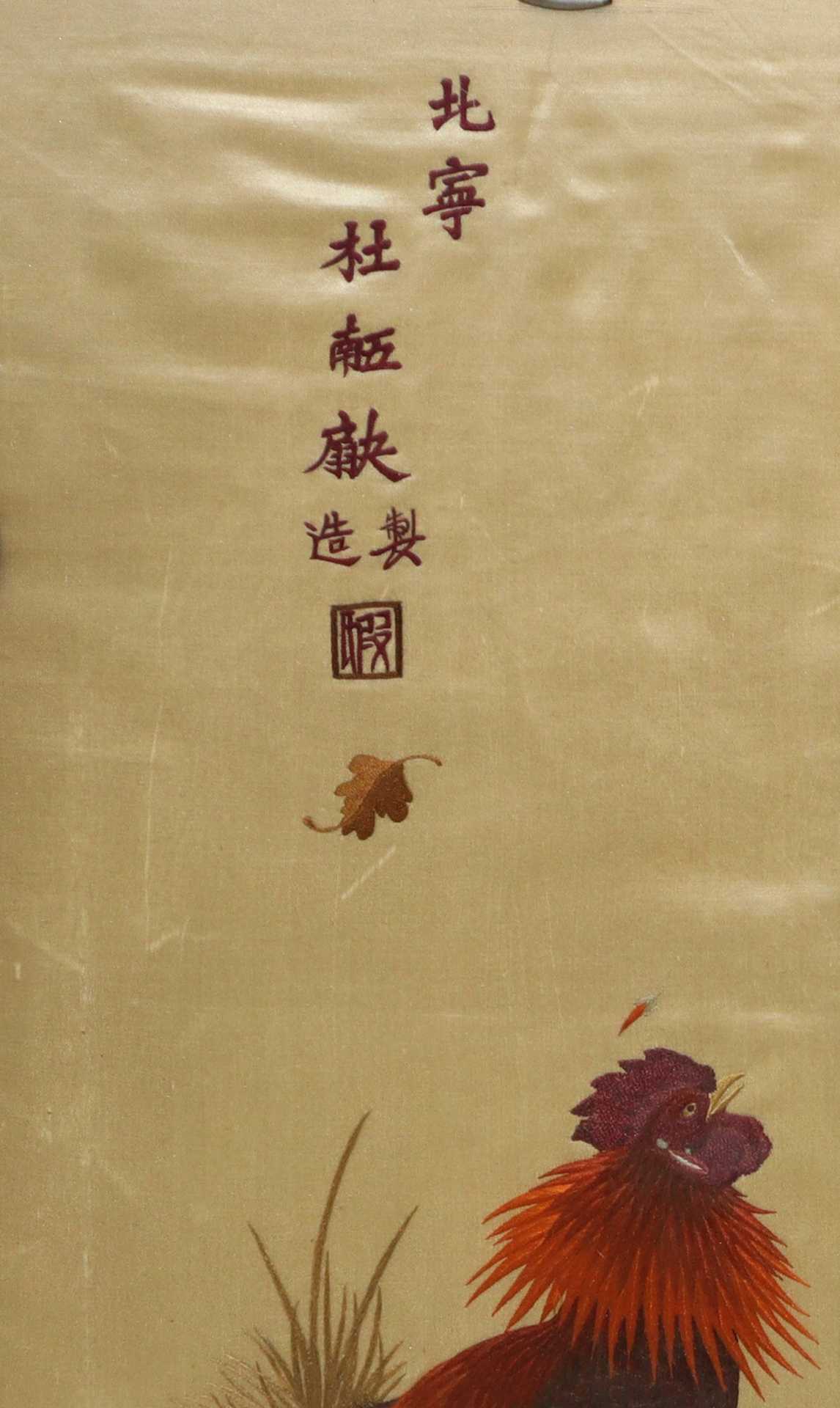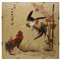 Galli in combattimento. cm 55,5X55,5 Ricamo su seta Ricamo a caratteri orientali al centro a sinistra