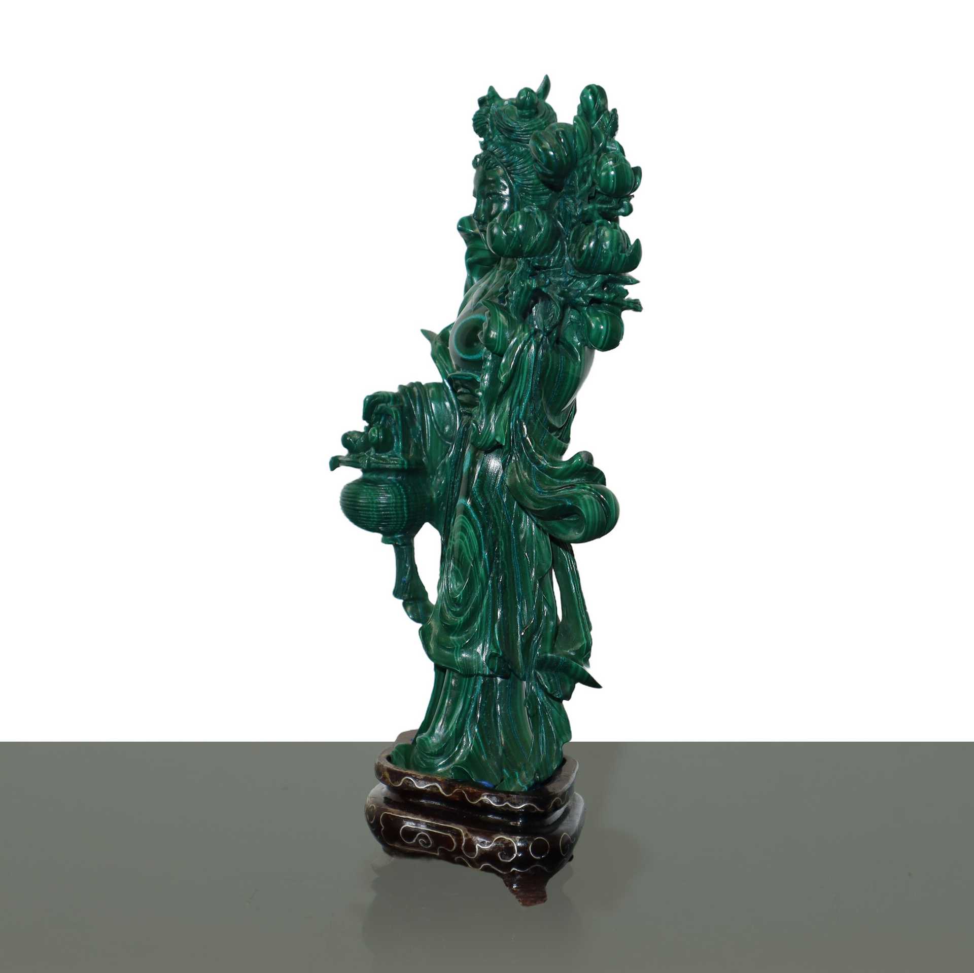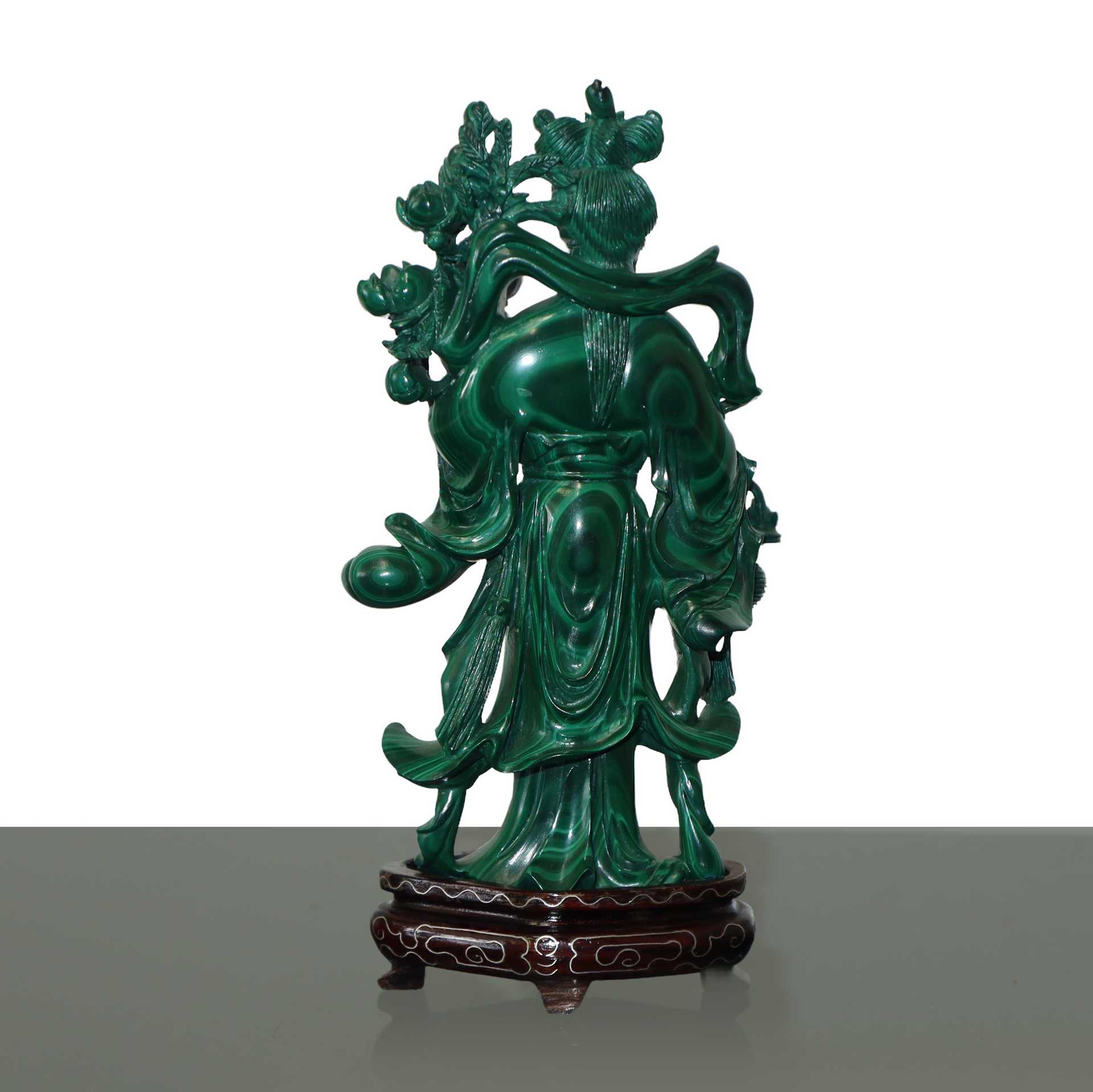 Guayin con fiori di loto e cesto in mano in malachite cm 19 con base