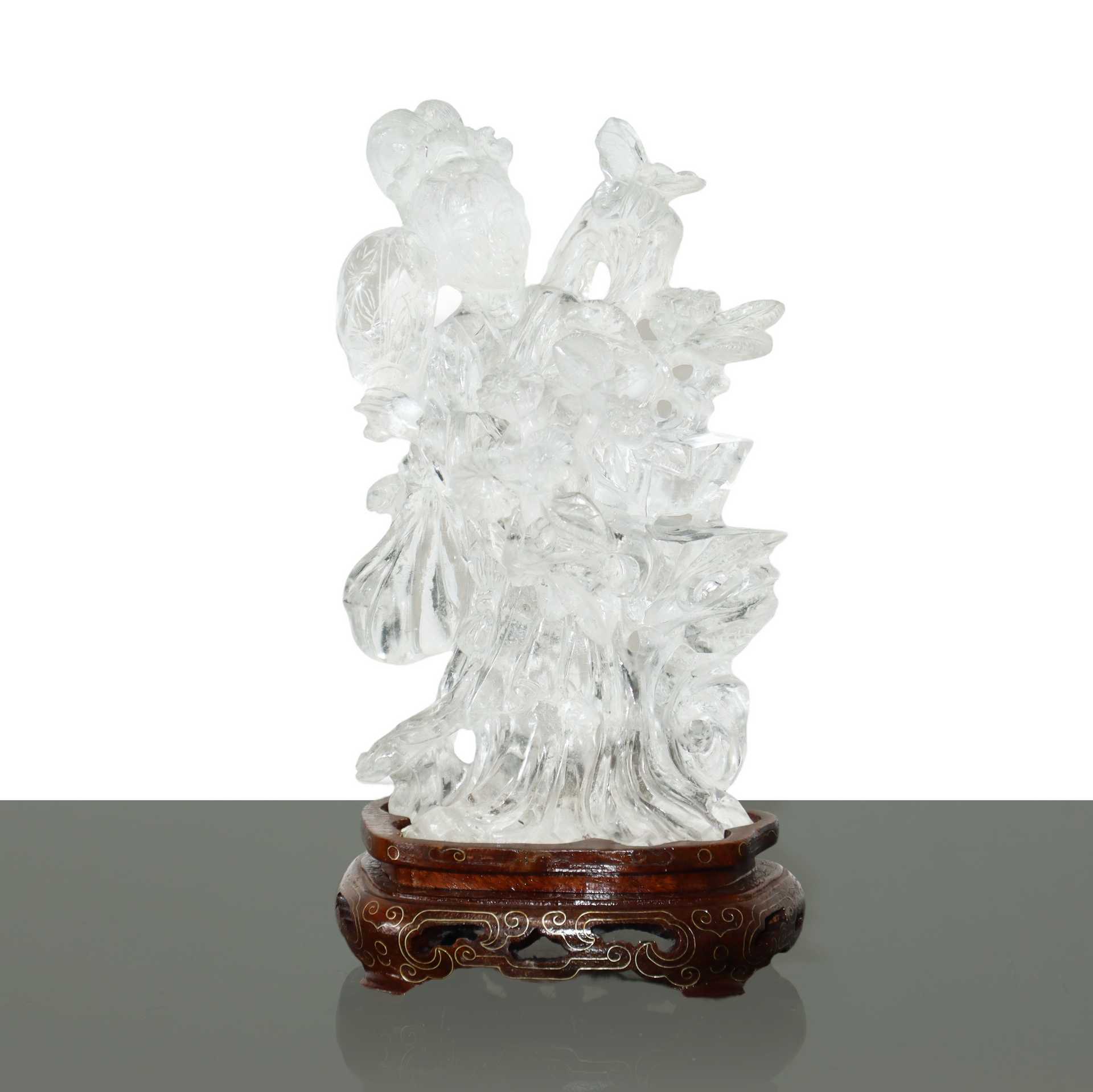 Guayin in cristallo di rocca trasparente con fiori di loto in mano cm 18 con base