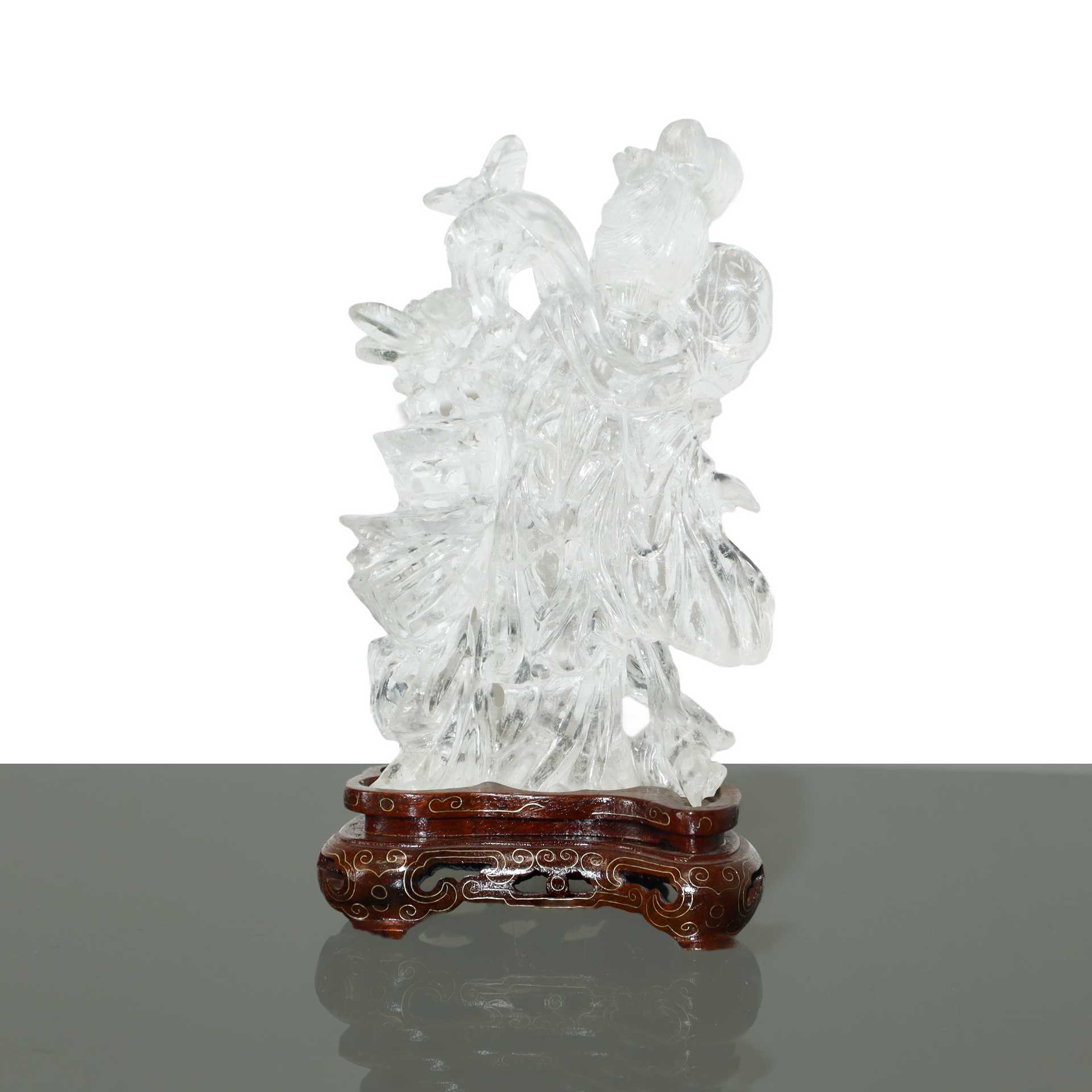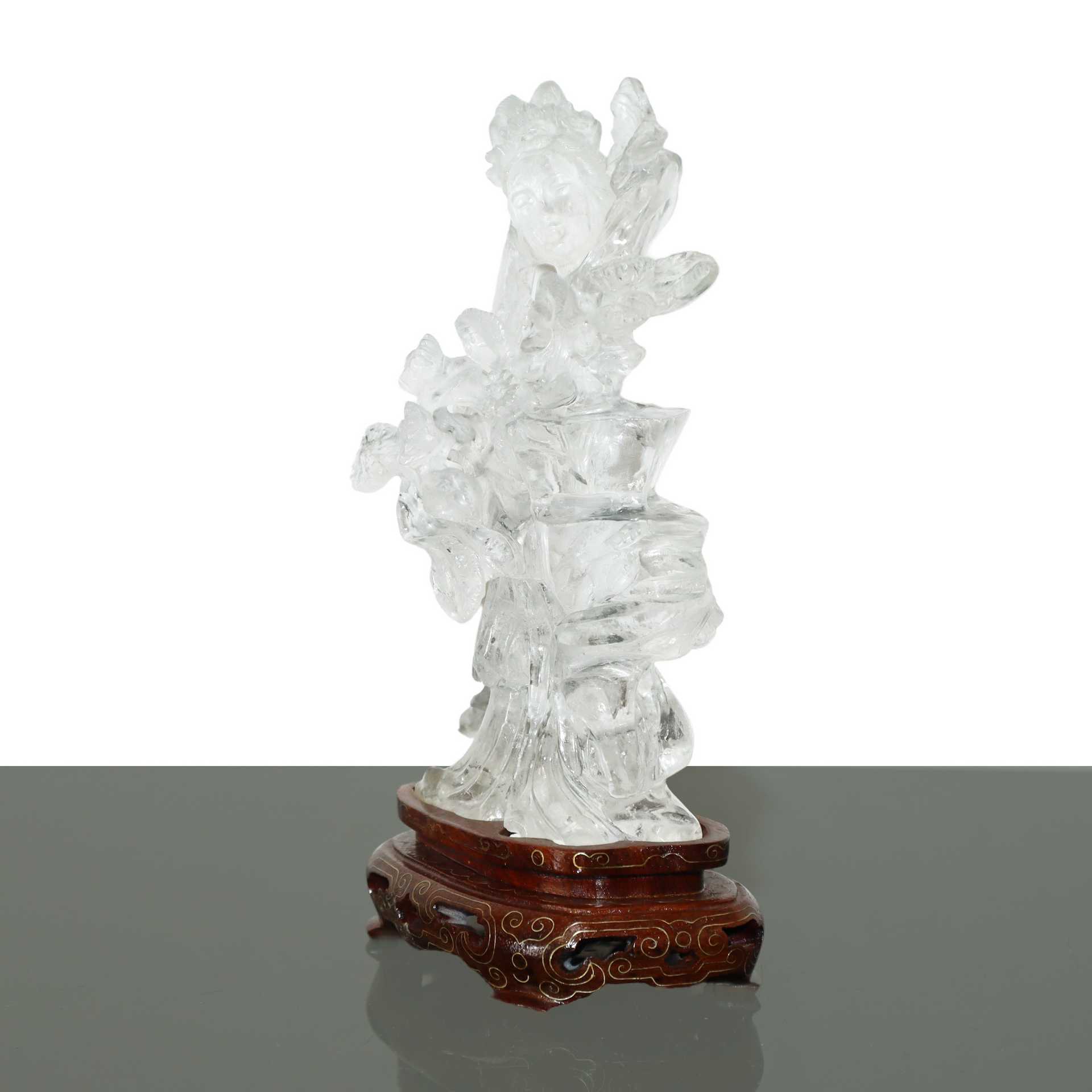 Guayin in cristallo di rocca trasparente con fiori di loto in mano