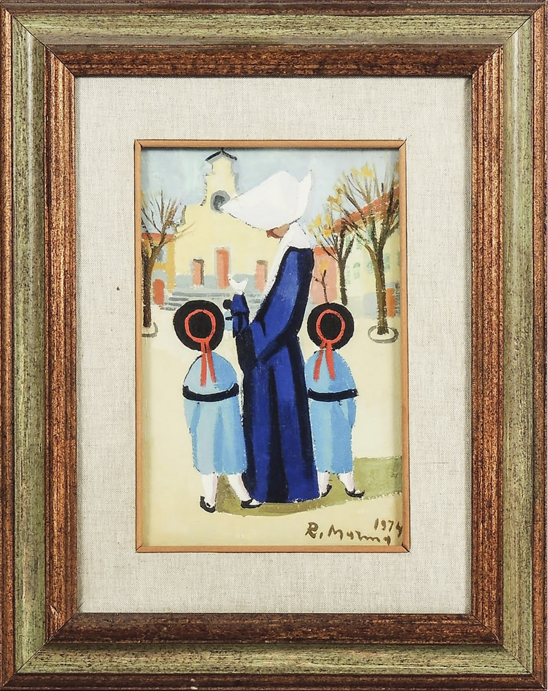 RODOLFO MARMA (1923-1999) Monachina - Nun and Children olio su cartone telato - oil on canvas board, firmato e datato 1974, al verso firmato, titolato e datato, in cornice cm 30x20