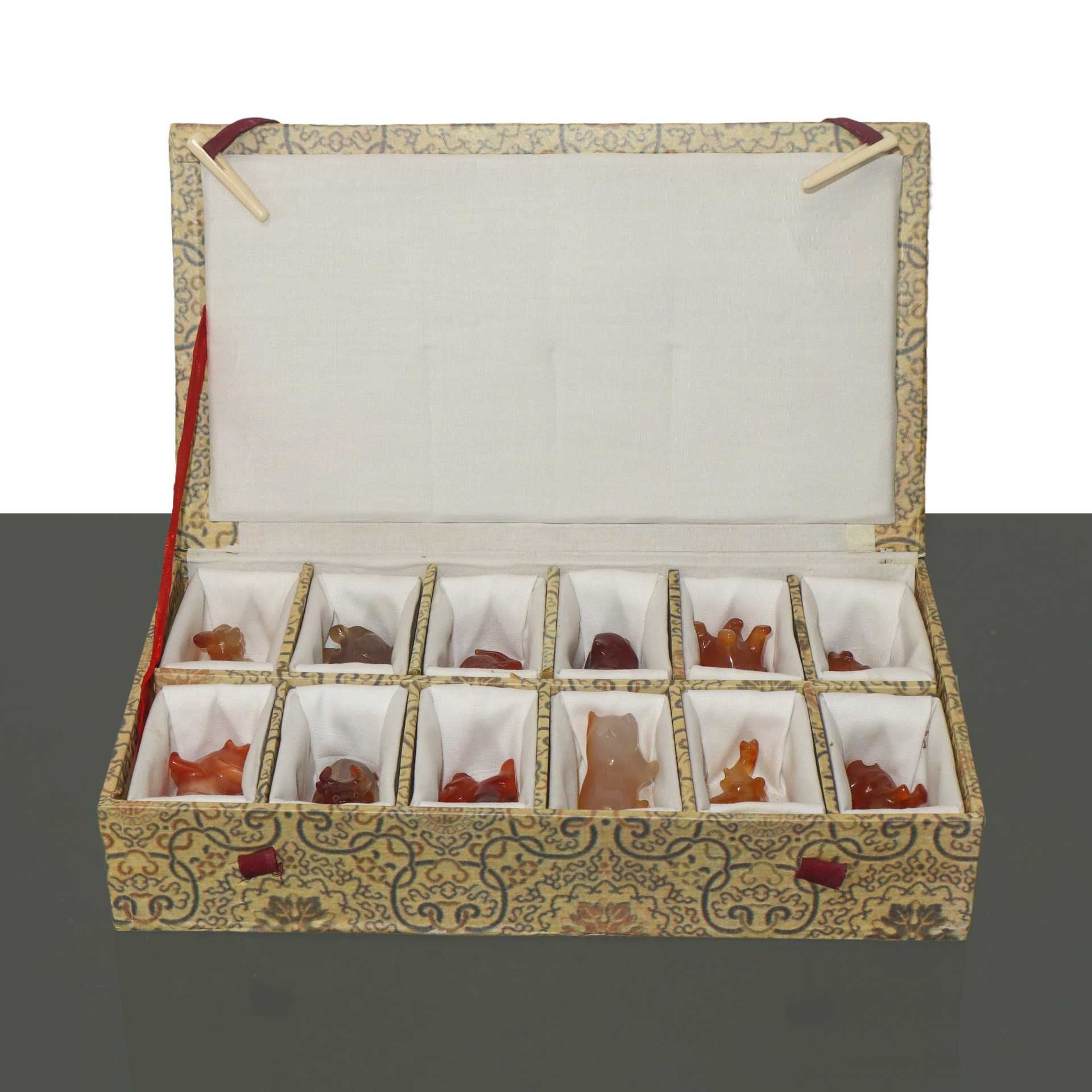 Dodici animaletti in corniola cm 1X5 cad circa misure scatola cm4,8X24 Dotati di scatola con custodia in stoffaDotati di scatola con custodia in stoffa
