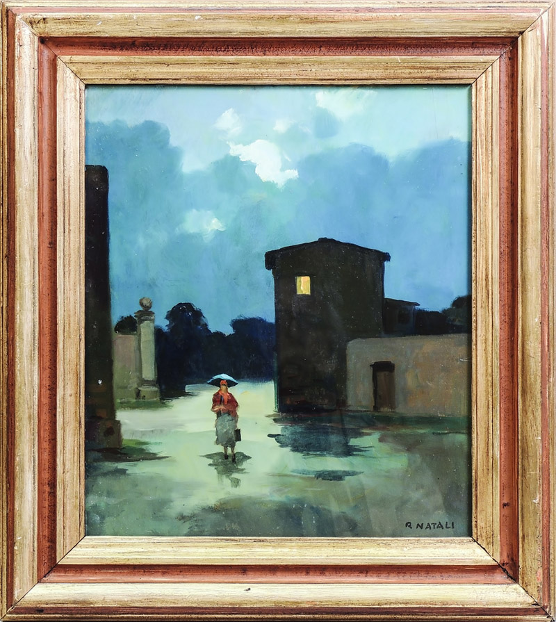 RENATO NATALI (1883-1979) Paesaggio notturno con figura - Nocturnal Landscape with a Figure olio su tavoletta - oil on panel, firmato, al verso firmato, in cornice cm 40x36