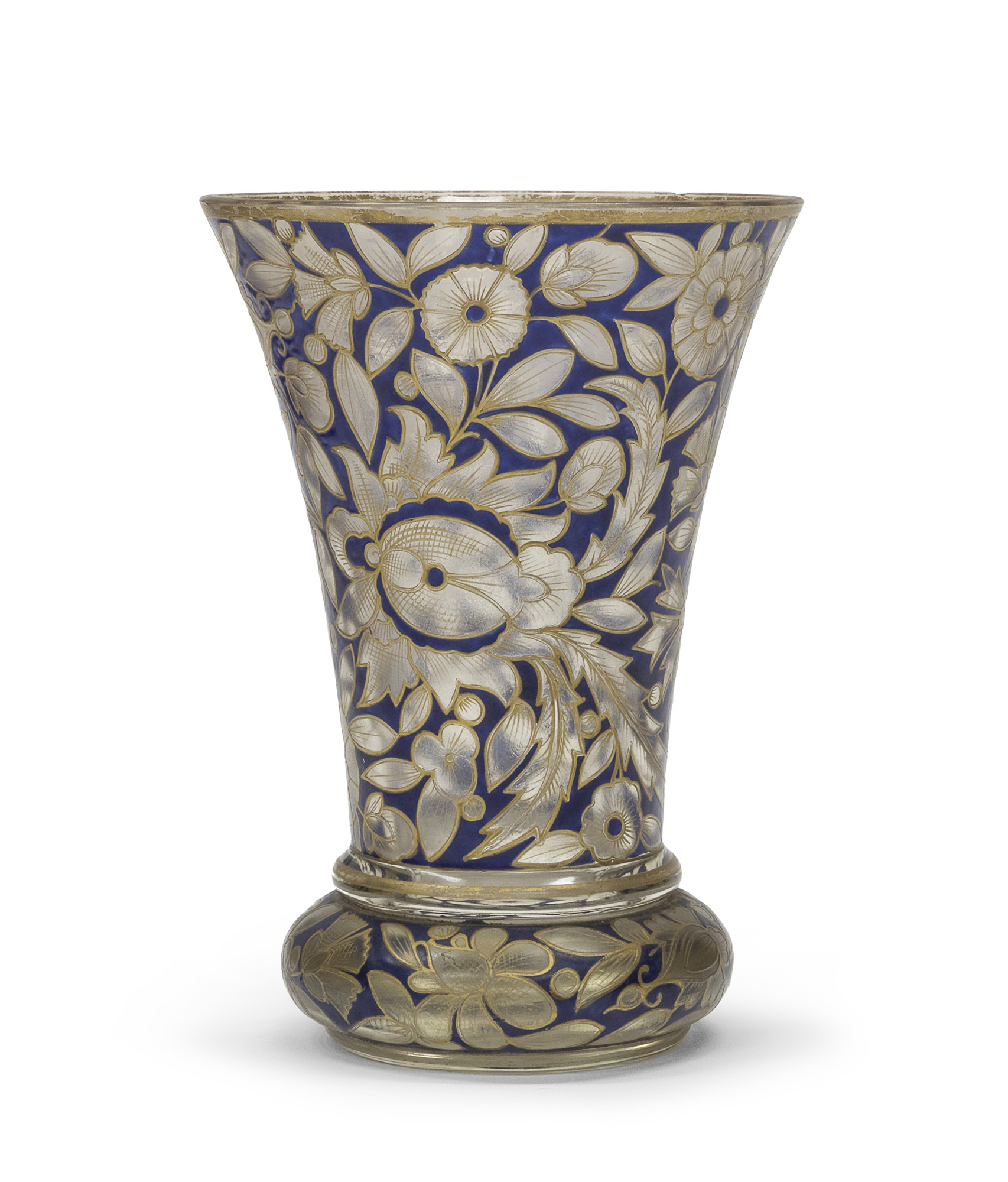 in vetro a forma di calice a fondo trasparente con decoro floreale.