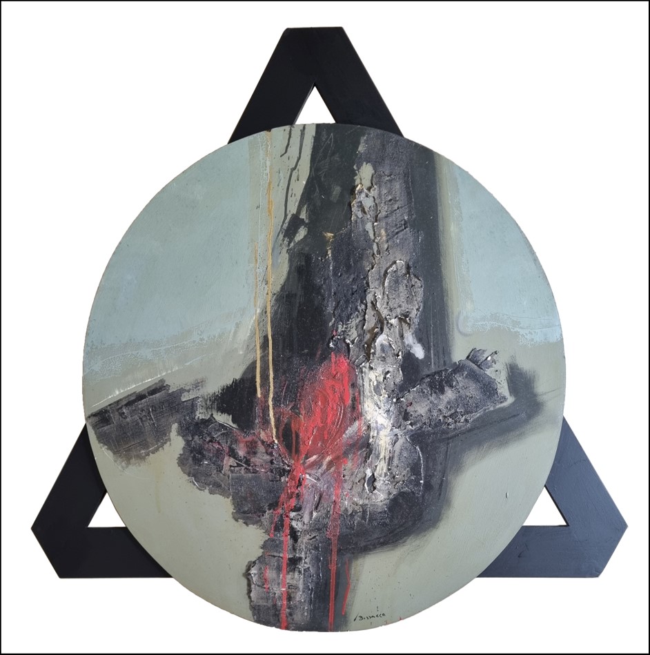 BISSACCO MARTINO Taglio di Po 1941 "Il tempo e la forma" Tecnica mista su tavola circolare, diam. cm 80, applicata su supporto in legno cm 98x98 (totali). Firmata sul fronte in basso a destra, al verso misure, titolo e firma.