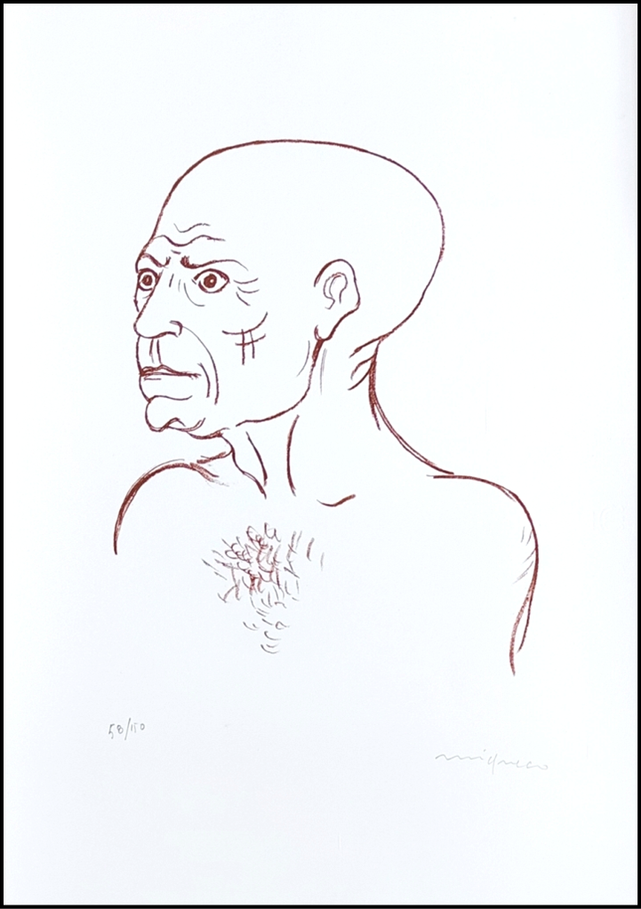 MIGNECO GIUSEPPE Messina 1903 - Milano 1997 "Omaggio a Picasso" Litografia su cartoncino cm 35x50. Firmata sul fronte in basso a destra, tiratura 58/150 a sinistra. Certificato di autenticità a cura di Casa d'Aste Vercelli.