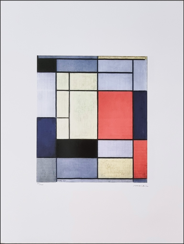 MONDRIAN PIET Paesi Bassi 1872 - New York 1944 "Senza titolo" Riproduzione litografica offset cm 50x66. Firma in stampa sul fronte in basso a destra, tiratura 57/200 e timbro a secco a sinistra. Sul retro ologramma di autenticità.
