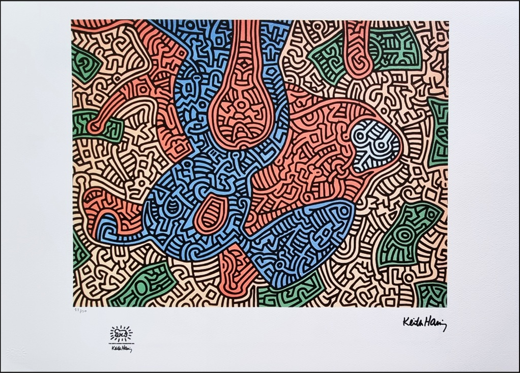 HARING KEITH Pennsylvania 1958 - New York 1990 "Senza titolo" Riproduzione litografica offset cm 70x50. Firma in stampa sul fronte in basso a destra, tiratura 72/150, timbro a secco e timbro in stampa a sinistra.