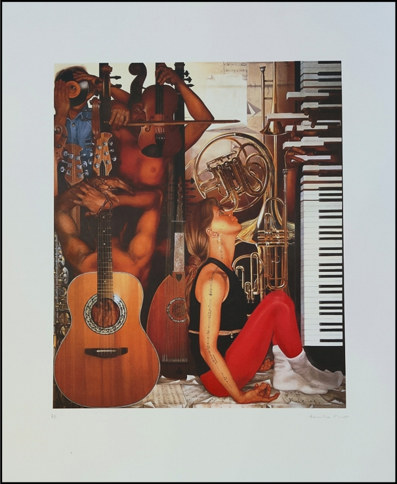 BRERO DOVILIO Torino 1950 "La musica" Litografia su cartoncino cm 70x84. Firmata sul fronte in basso a destra, esemplare P.A. a sinistra. Sul retro certificato di garanzia a cura dell'Istituto Grafico Italiano.