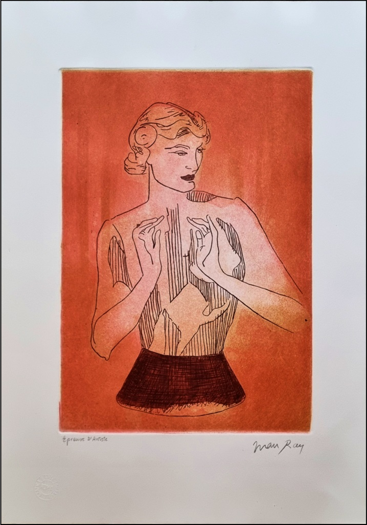 MAN RAY - EMMANUEL RADNITZKY Filadelfia 1890 - Parigi 1976 "Le mannequin" Incisione originale cm 35x49,5 del 1975. Firmata sul fronte in basso a destra, tiratura prova d'autore e timbro a secco a sinistra. Sul retro timbro di garanzia a cura della Grafica d'arte Lombardi.