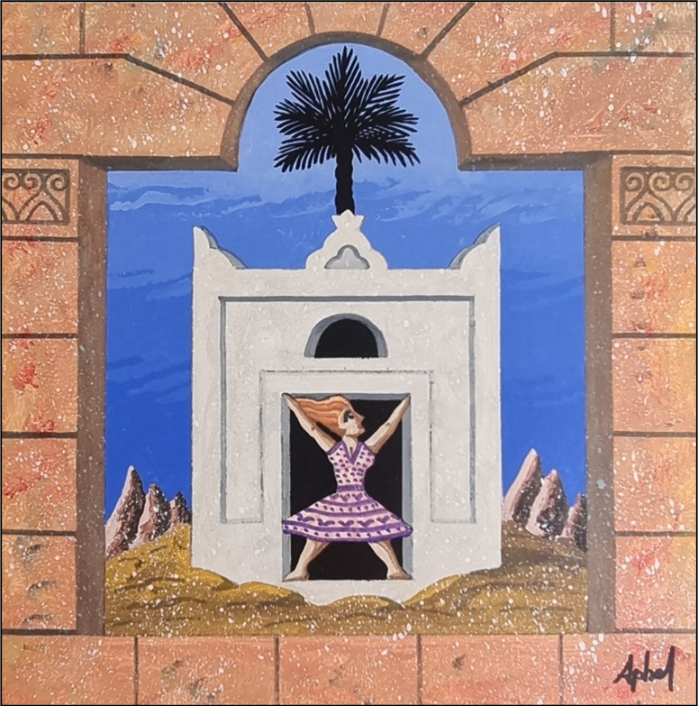 APHEL FABIO Cavalese (TN) 1957 "La casa della palma" Olio su tavola cm 25x25. Firmato sul fronte in basso a destra, sul retro titolo, firma e dimensioni.
