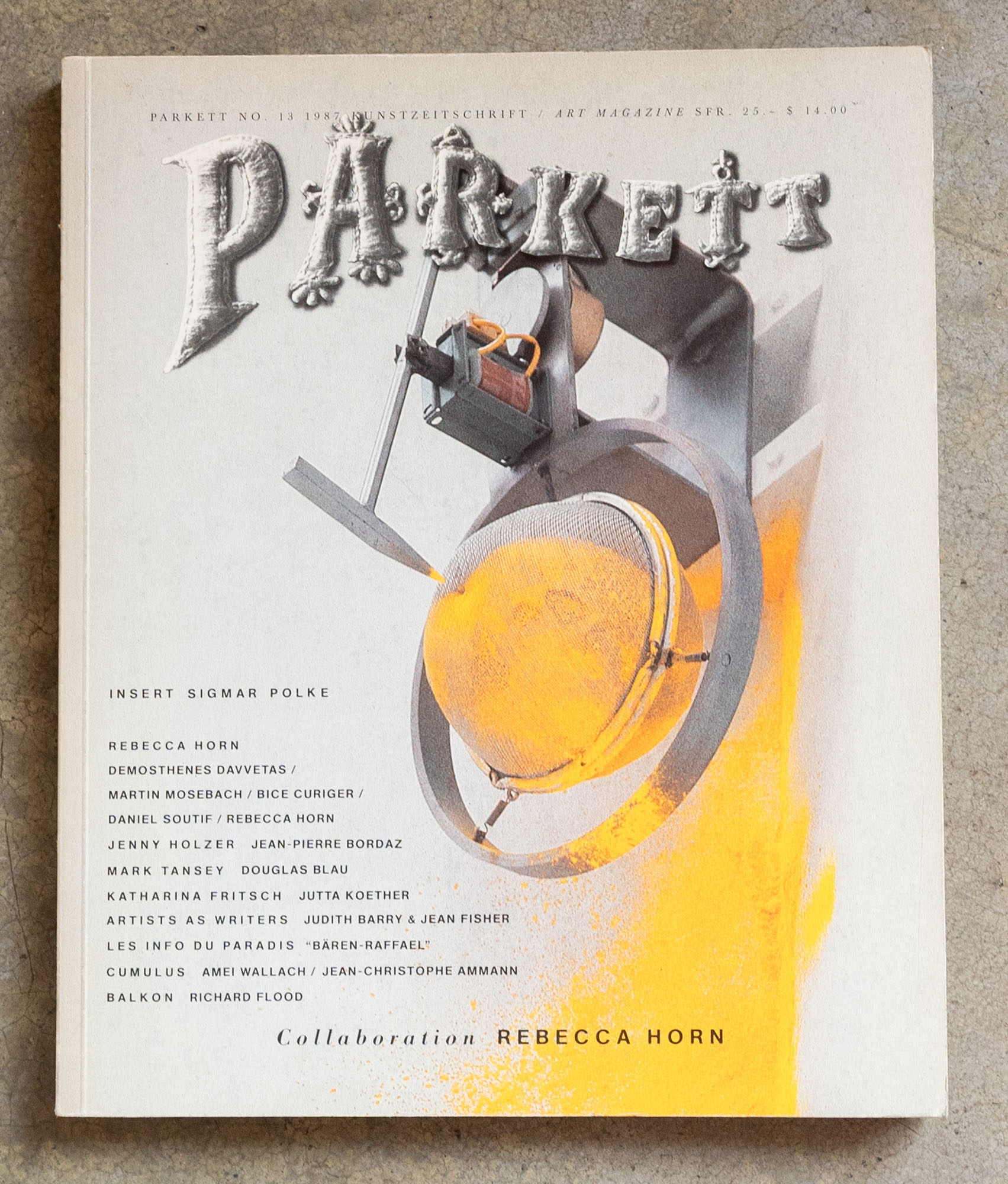 AUTORI VARIParkett Vol. 131987Rivista in collaborazione con Rebecca Horn, Demosthenes Davvetas, Martin Mosebach, Bice Curiger, Daniel Soutif, Jenny Holzer, Jean-Pierre Bordaz, Mark Tansey, Douglas Blau, Katharina Fritsch, Jutta Koether, Judith Barry & Jean Fisher, Sigmar Polke25,5 x 21,5 cmPagine 133Difetti