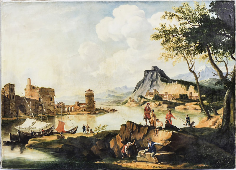 PAESAGGIO FLUVIALE CON PERSONAGGI - RIVER LANDSCAPE WITH FIGURES olio su tela...