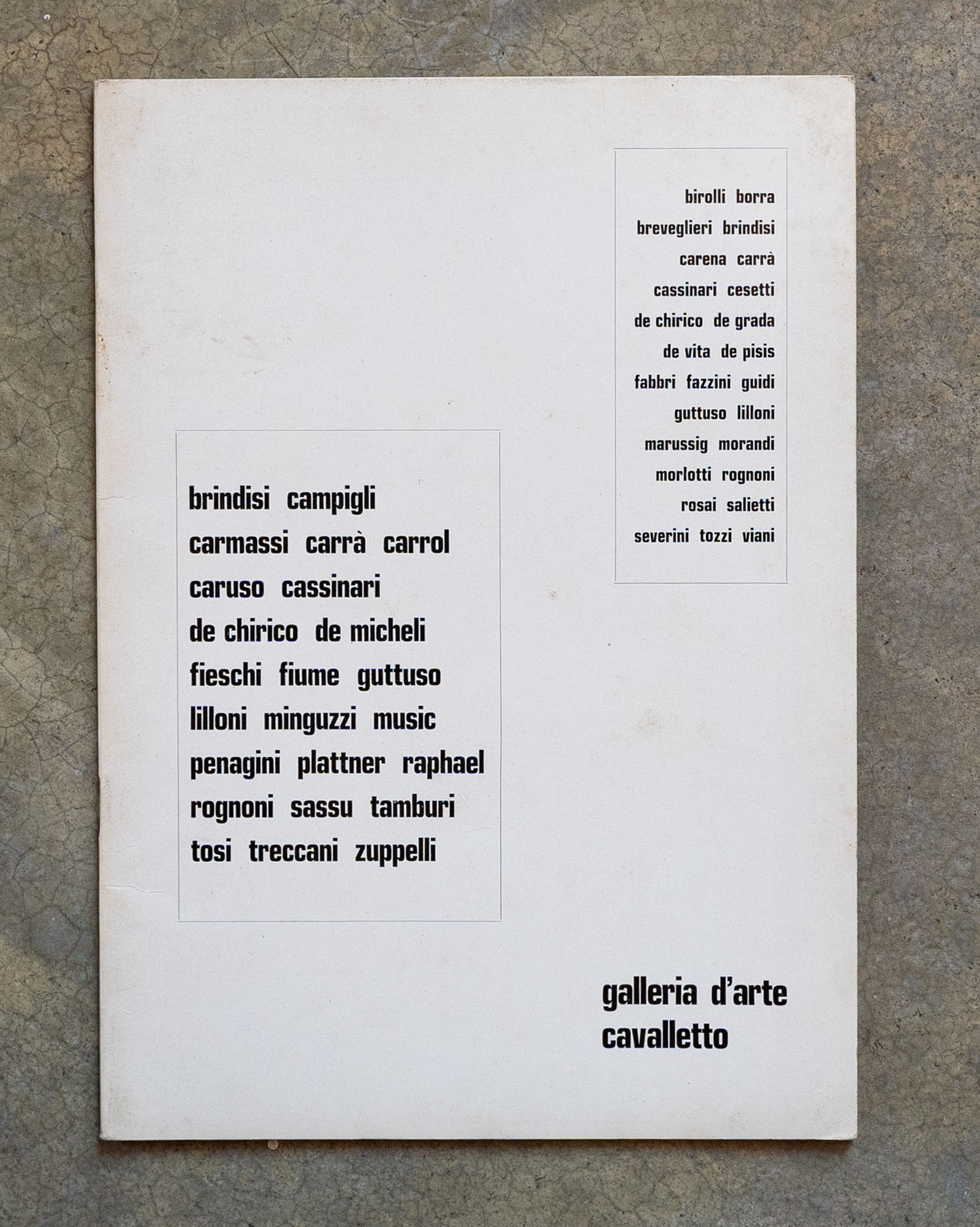 AUTORI VARIPanoramica di pittori italiani1969Catalogo monografico illustrato edito in occasione della mostra tenutasi presso la Galleria d'Arte Cavalletto, Brescia (giugno 1969)23,5 x 17 cmEdizione della galleriaSenza numero di pagineDifetti
