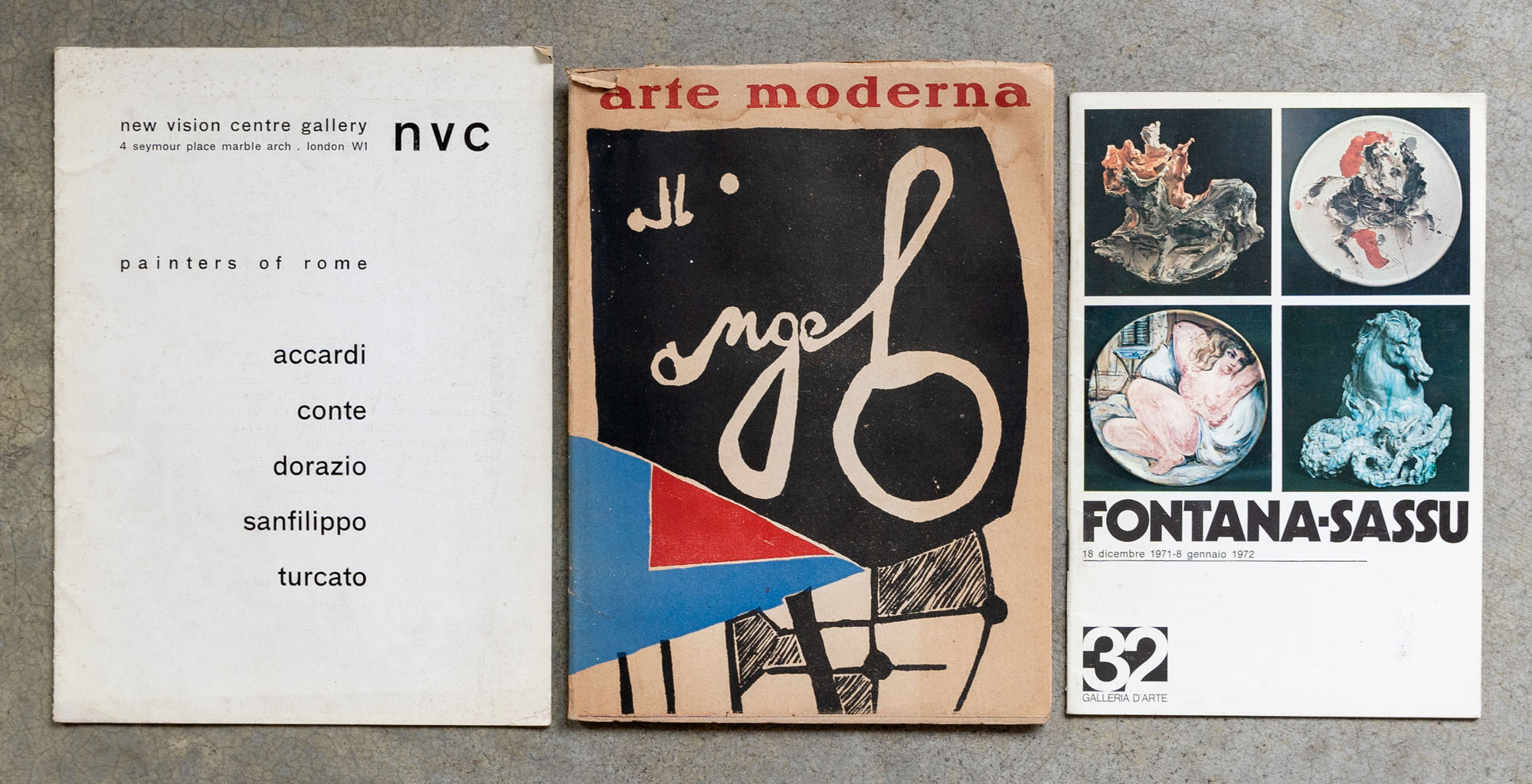 LOTTO MULTIPLOLotto di tre cataloghiFontana - Sassu1971Catalogo illustrato edito in occasione della mostra tenutasi presso la Galleria d'Arte Trentadue, Milano (18 dicembre 1971 - 8 gennaio 1972)21 x 13,5 cmEdizione della galleriaSenza numero di pagineDifettiArte moderna all'angelo1947Catalogo illustrato22 x 16 cmNeri Pozza EditorePagine 56DifettiPainters of Rome (Accardi, Conte, Dorazio, Sanfilippo, Turcato)1959Catalogo monografico illustrato edito in occasione della mostra tenutasi presso la New Vision Centre Gallery, Londra (1 giugno - 20 giugno 1959)23 x 17 cmEdizione della galleriaSenza numero di pagineDifetti