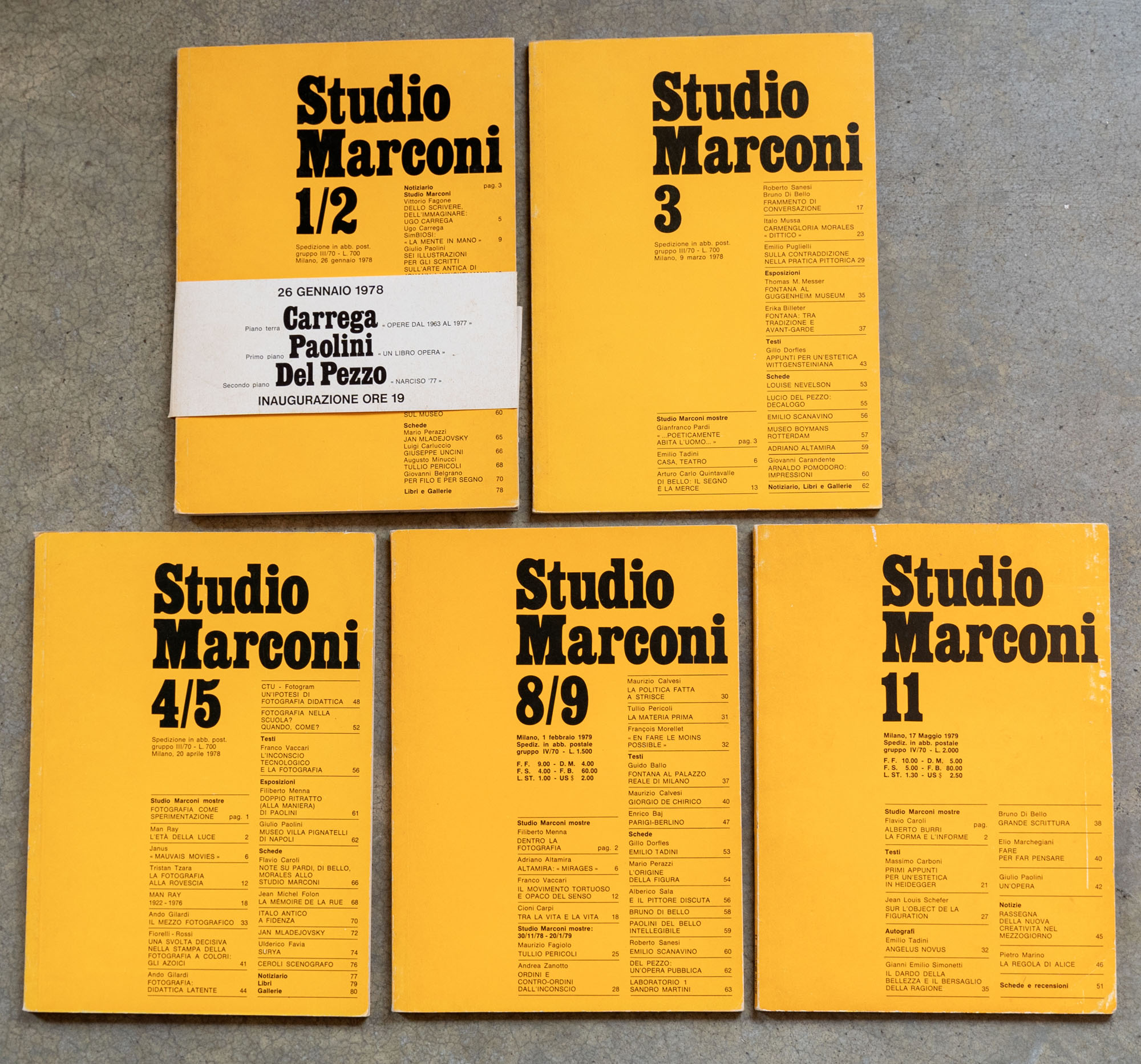 LOTTO MULTIPLOLotto di cinque cataloghi1978 - 1979Studio Marconi n, 1/2, 3, 4/5, 8/9, 11Ogni catalogo misura 20,5 x 15 cmEdizione della galleriaDifetti