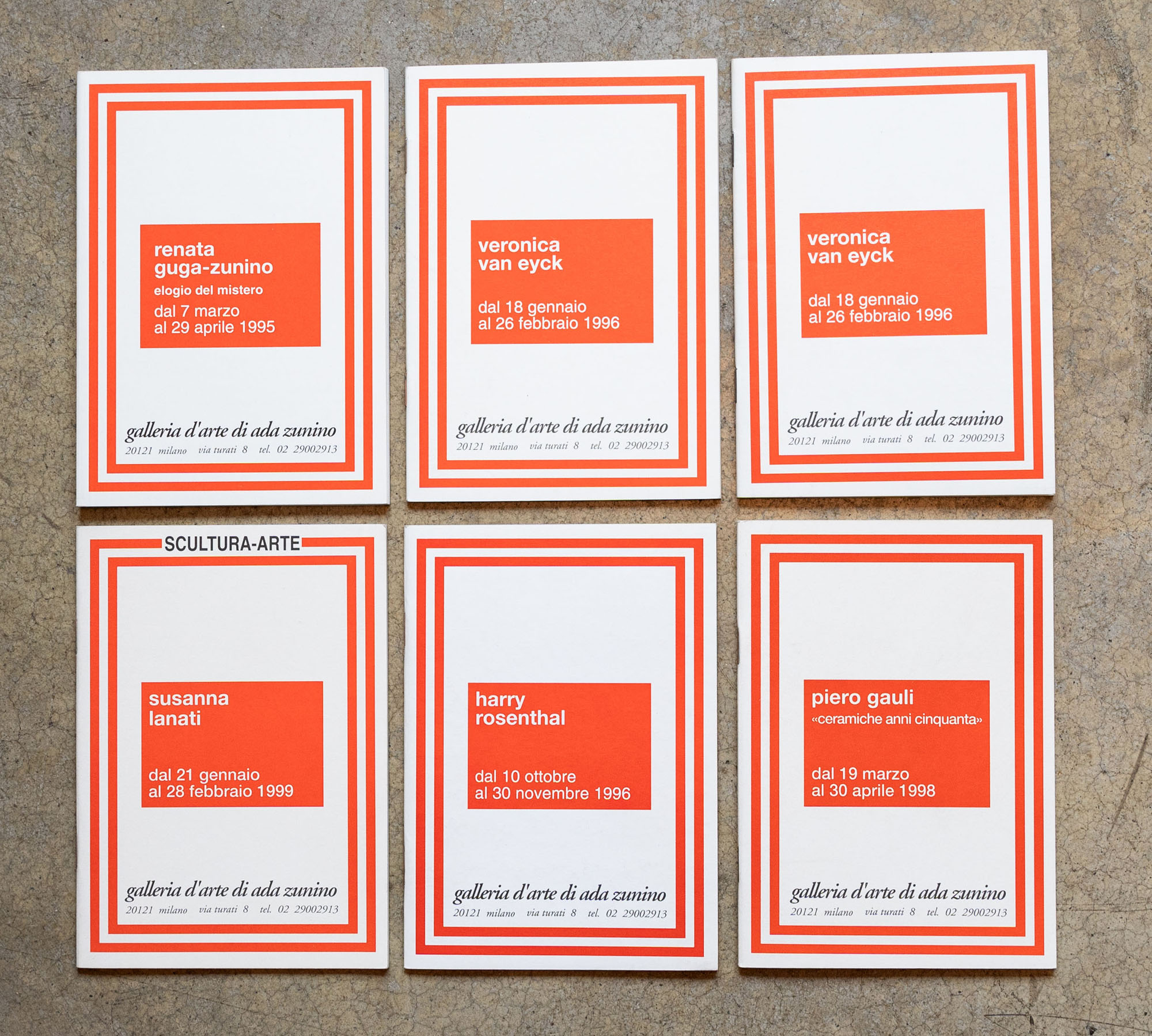 LOTTO MULTIPLOLotto di sei pubblicazioni e un catalogoDal 1995 al 1999Pubblicazioni realizzate in occasione delle mostre di Veronica Van Eyck, Susanna Lanati, Piero Gauli, Harry Rosenthal e Renata Guga-Zunino tenutesi presso la Galleria d'Arte di Ada Zunino, MilanoDolores Previtali - Quarantadue. Viaggio senza fine2014Catalogo illustrato28 x 21 cmPagine 172Senza difetti17 x 12 cmEdizioni della galleriaSenza difetti