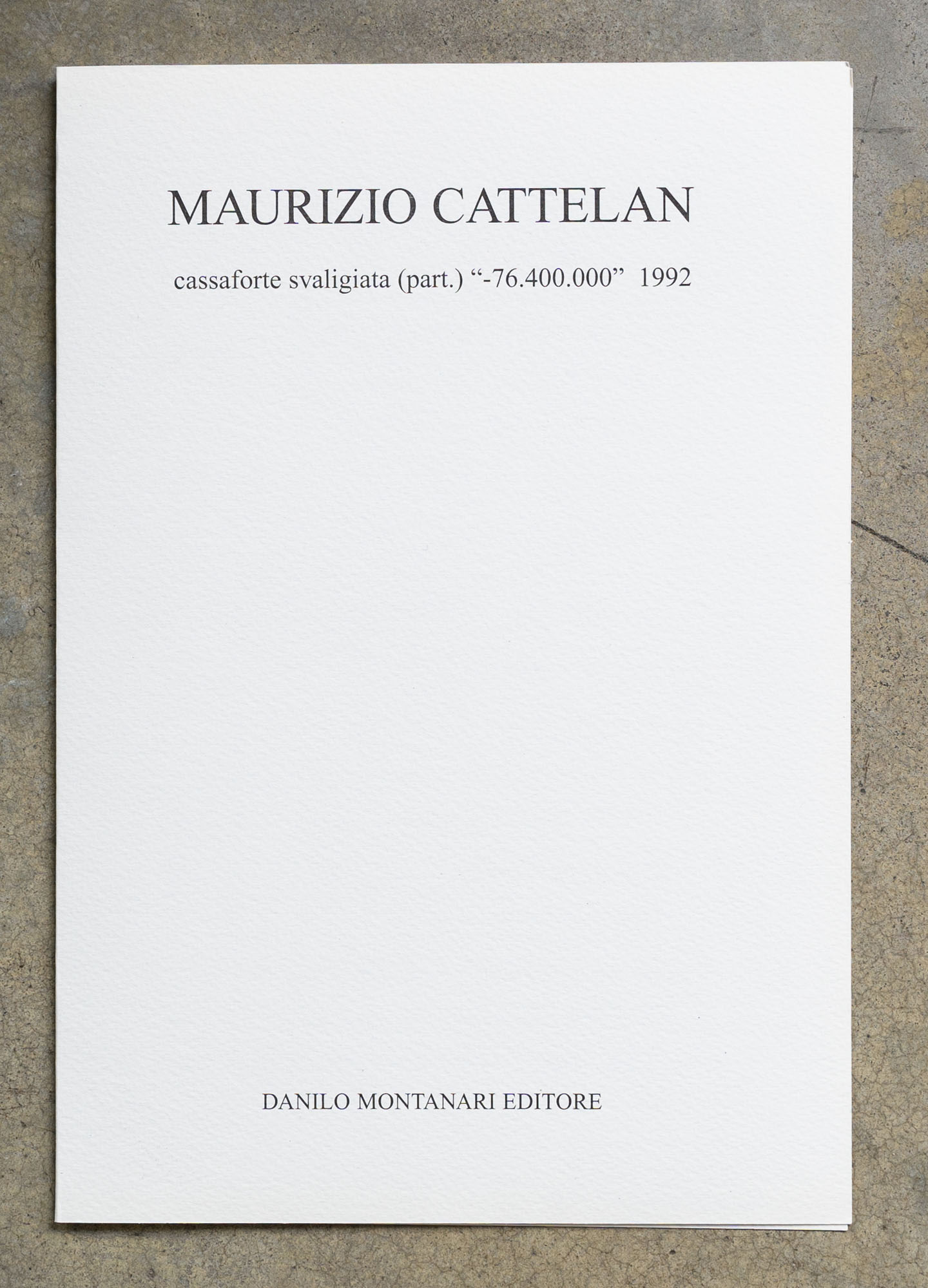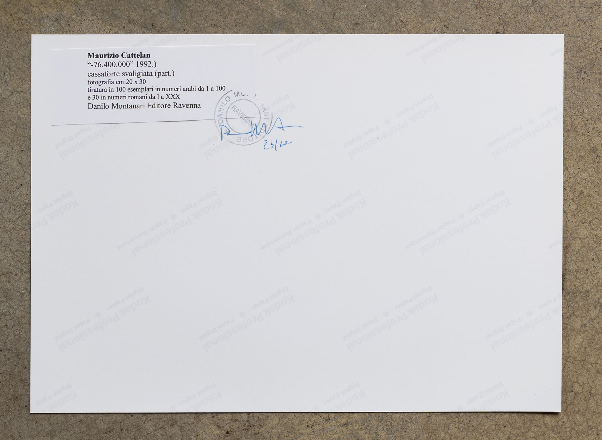 MAURIZIO CATTELAN(1960)Cassaforte svaligiata (part.) - 76.400.0001992Cartella contenente una stampa cibachrome, ed. 23/100 su una tiratura complessiva di 100 esemplari in numeri arabi e 30 in numeri romani, Danilo Montanari Editore, RavennaDimensioni della cartella: 32 x 22 cmDimensioni della stampa cibachrome: 20 x 27,8 cmTimbro e firma Danilo Montanari Editore e numerazione al retro della stampa cibachrome