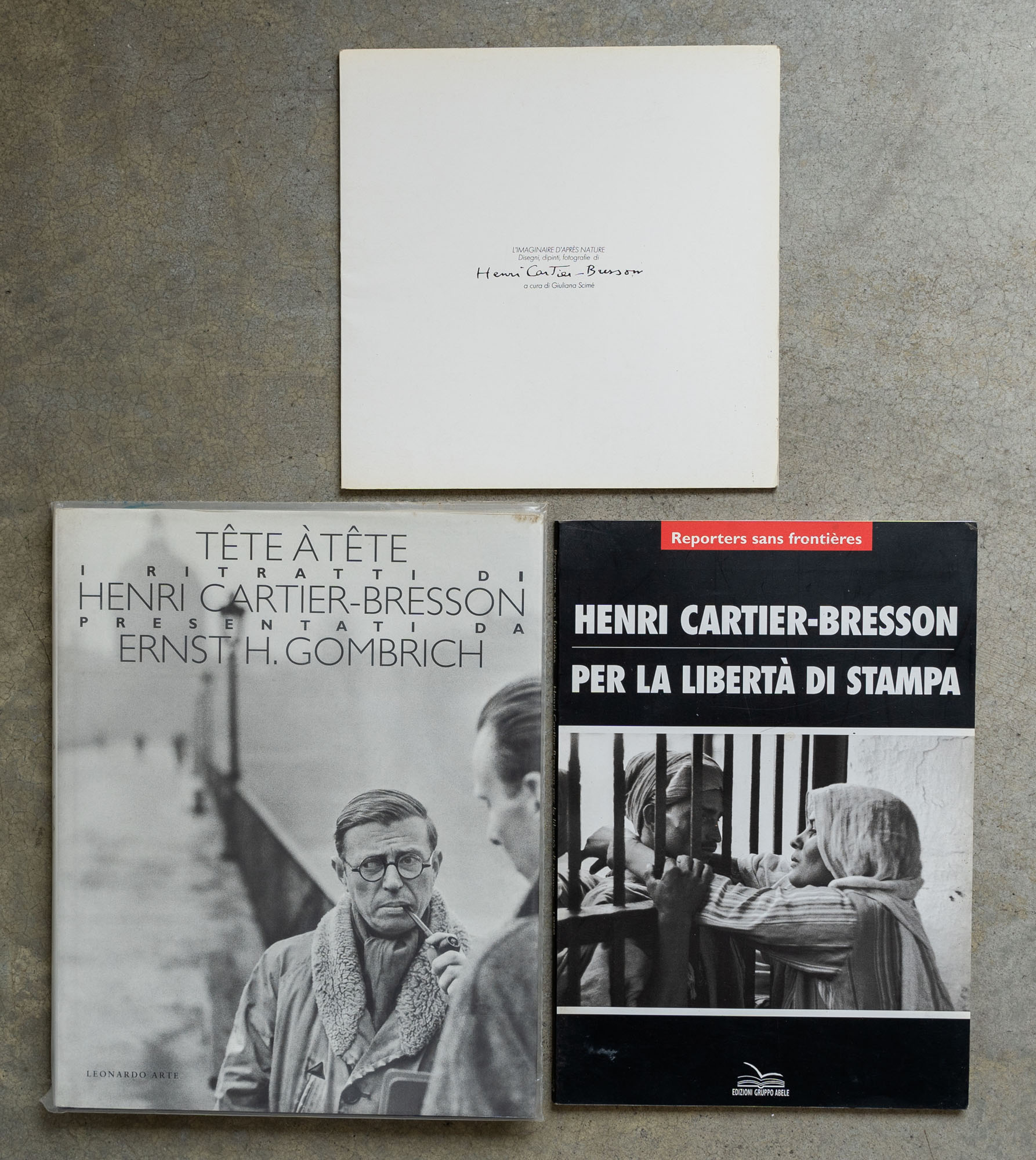 HENRI CARTIER BRESSON(1908 - 2004)Lotto di tre cataloghiL'imaginaire d'après nature. Disegni, dipinti, fotografie di Henri Cartier-Bresson1983Catalogo monografico illustrato edito in occasione della mostra tenutasi presso il Padiglione d'Arte Contemporanea, Milano (8 settembre - 10 ottobre 1983)22 x 22 cmEdizione Nava MilanoSenza numero di pagineDifettiHenri Cartier-Bresson. Per la libertà di stampa1999Catalogo monografico illustrato30 x 21 cmEdizioni Gruppo AbelePagine 76DifettiTete a tete. I ritratti di Henri Cartier-Bresson presentati da Ernst H. Gombrich1999Catalogo illustrato31 x 24,5 cmEdizione Leonardo ArteSenza numero di pagineDifetti