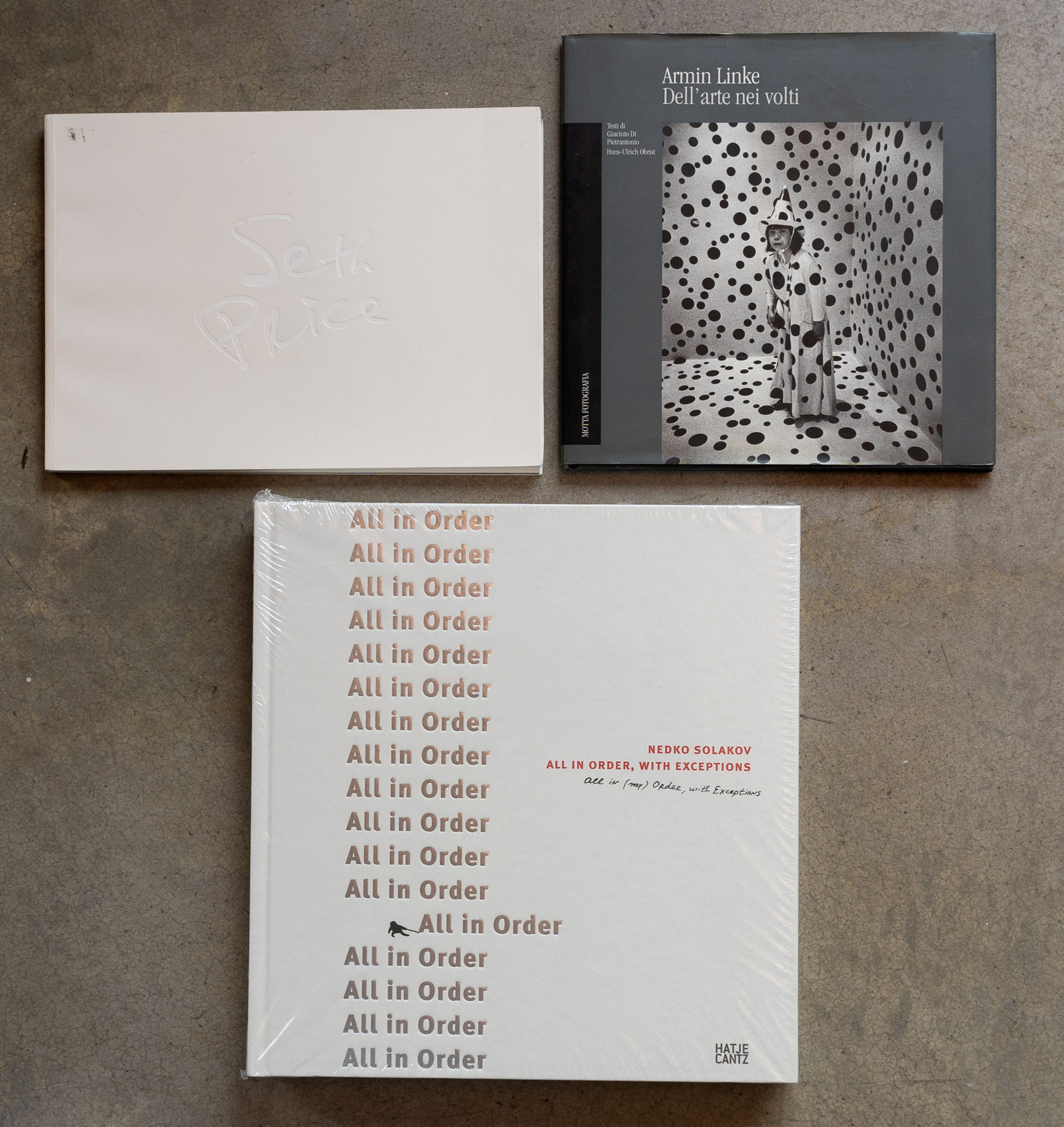 LOTTO MULTIPLOLotto di tre cataloghiArmin Linke. Dell'arte nei volti1994Catalogo monografico illustrato23 x 23 cmFederico Motta EditorePagine 45DifettiSeth Price2009Catalogo illustrato edito in occasione della mostra tenutasi presso il MAMbo, Bologna (26 maggio - 26 luglio 2009)19 x 26,5 cmEdizione del museoDifettiAll in order, with exceptions1989Catalogo illustrato edito in occasione della mostra tenutasi presso Ikon Gallery, Birmingham, S.M.A.K., Ghent, Museo Serravalves, Porto e Galleria Civica, TrentoEdizione Hatje Cantz30 x 28 cmNuovo con cellofanHatje Cantz