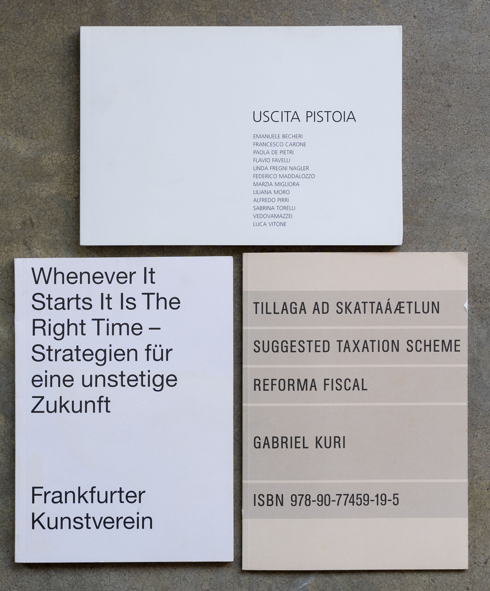 LOTTO MULTIPLOLotto di tre cataloghiGabriel Kuri - Tillaga ad Skattaaætlun, Suggested Taxation Scheme, Reformal Fiscal2007Catalogo illustrato24 x 17 cmEdizione Roma PublicationsSenza numero di pagineDifettiUscita Pistoia2006Catalogo illustrato17 x 24 cmEdizione Gli OriPagine 104DifettiWhenever it starts it is the right time - Strategien für eine unstetige Zukunft 2007Catalogo illustrato edito in occasione della mostra tenutasi presso la galleria Frankfurter Kunstverein (23 marzo - 6 maggio 2007)23 x 16,5 cmEdizione RevolverPagine 80 Senza difetti