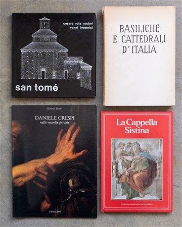 LOTTO MULTIPLOLotto di quattro libriBasiliche e cattedrali d'Italia1950Libro illustrato, firmato sulla prima pagina24 x 17 cmEdizione I.G.D.A.Pagine 200DifettiEugenio Battisti - La Cappella Sistina1986Libro illustrato25 x 17,5 cmEdizione I.G.D.A.Pagine 76DifettiGiovanni Testori - Daniele Crespi nelle raccolte private1989Libro illustrato28 x 21 cmFabbri EditoriPagine 56DifettiLa rotonda di San Tomé in almenno San Bartolomeo1971Libro illustrato contenente dtre disegni di rilievo di Cesare Rota Nodari e Vanni Invernici20,5 x 20,5 cmEdizione ICISPagine 52Difetti