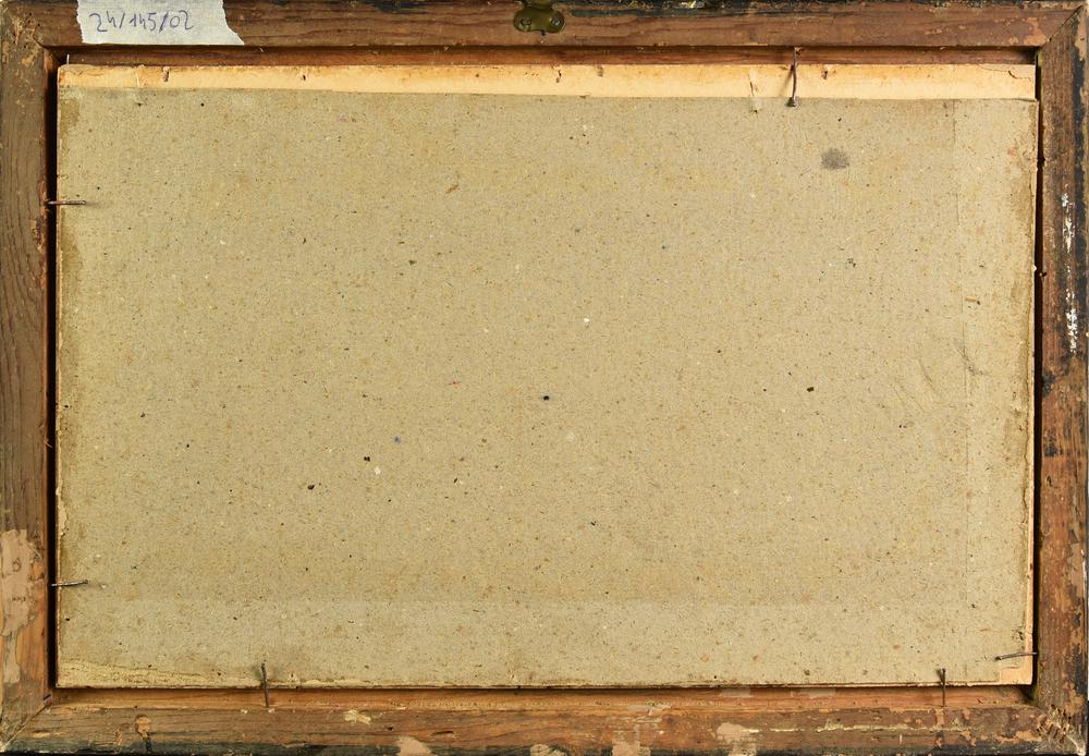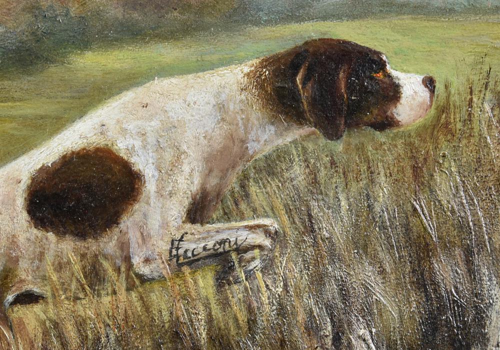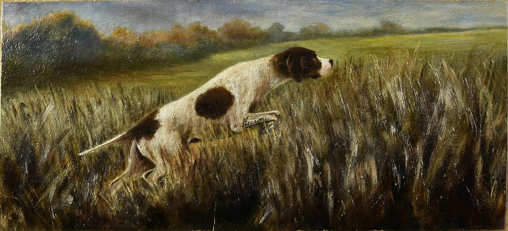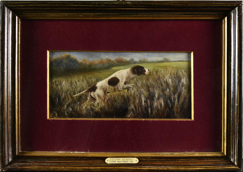 Eugenio Cecconi CANE DA CACCIA olio su cartoncino, cm 12,5x29,5 firma