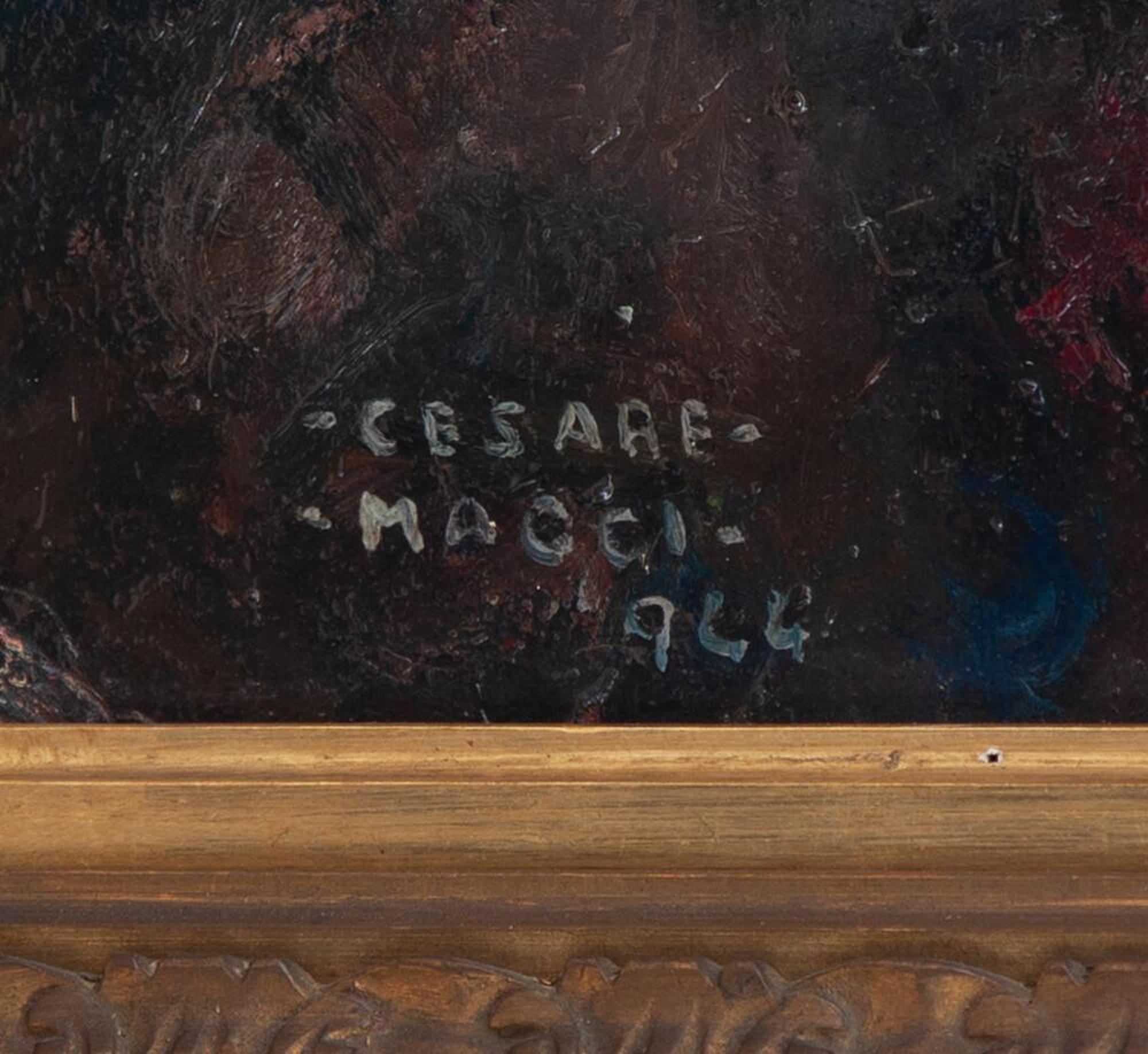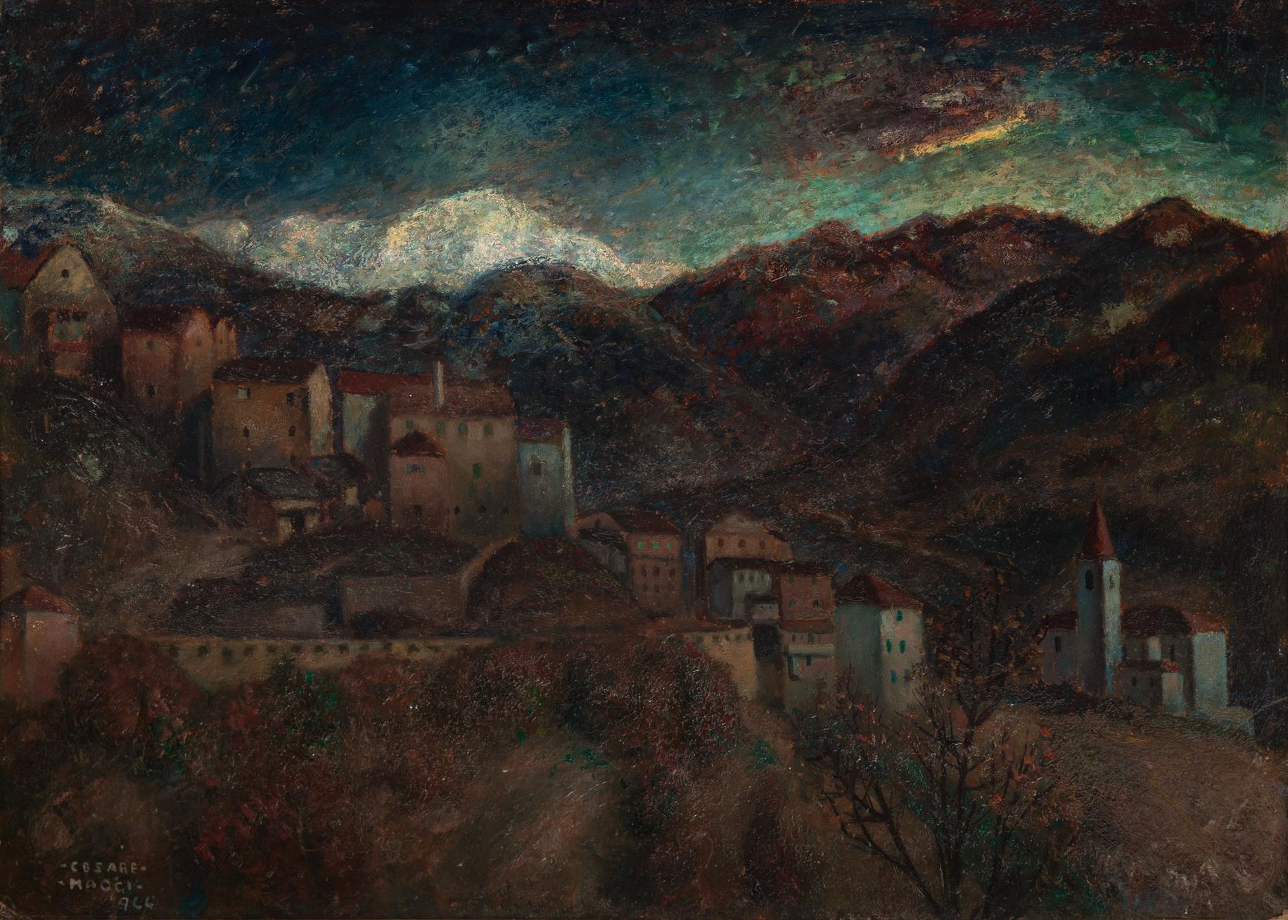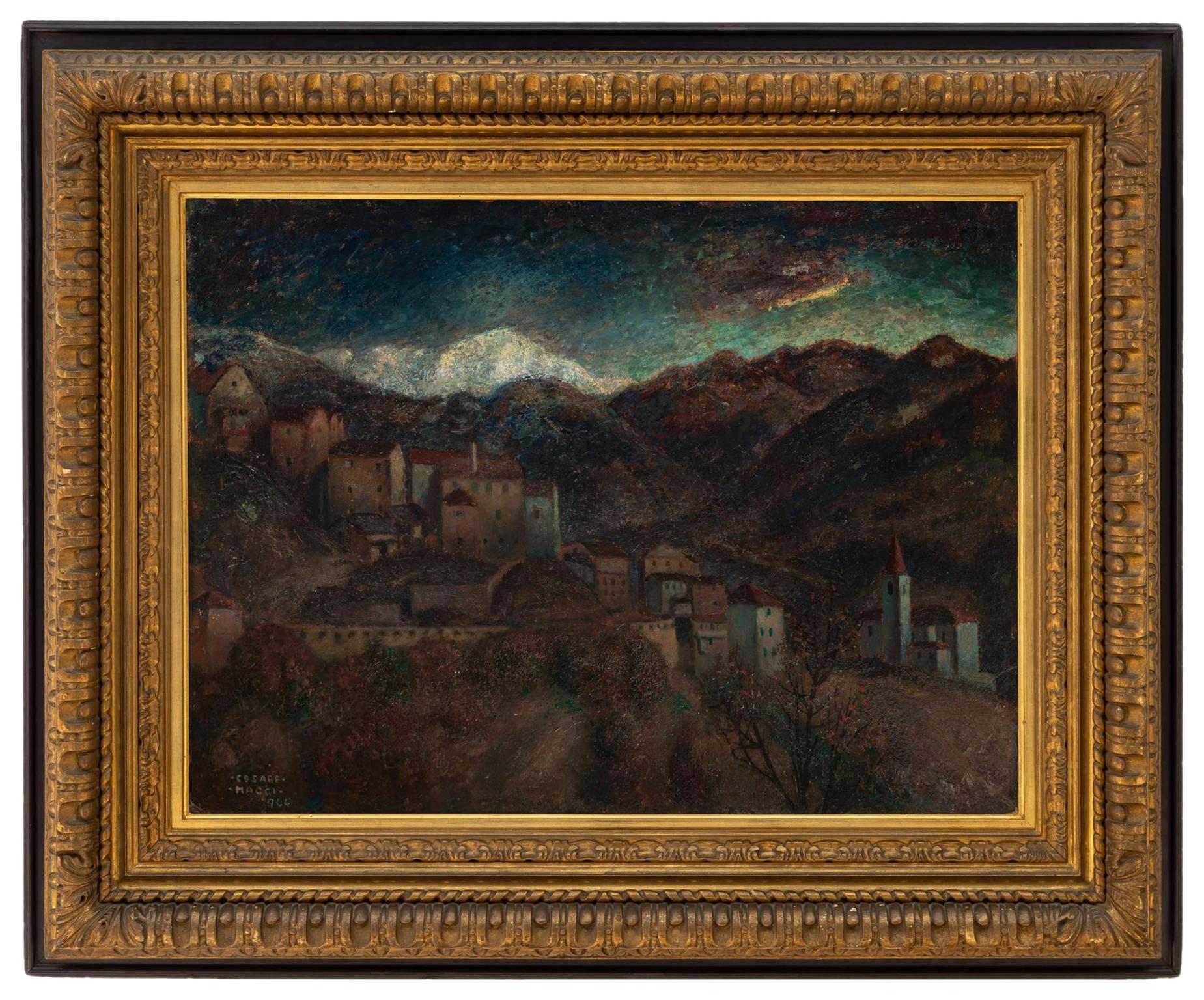 Cesare Maggi - alba in carnia (1944) - Roma 1881 - Torino 1962 - Olio su cartone cm 50x70 - Cesare Maggi, nato a Roma il 13 gennaio 1881, proveniva da una famiglia di attori. Dopo gli studi classici tra Firenze e Lucca, intraprese la sua formazione artistica presso gli studi di Vittorio Corcos e Gaetano Esposito. Esordì pubblicamente nel 1898 a Firenze e successivamente si recò a Parigi per frequentare l'accademia di Fernand Cormon. La sua carriera artistica fu influenzata dalla luce della pittura di Giovanni Segantini, e nel 1899 si trasferì nell'Engadina per seguire le sue tracce.Dopo la morte della madre nel 1900, Maggi si stabilì a Torino e iniziò le sue sperimentazioni artistiche a Forno Alpi Graie. Nel 1900, firmò un contratto esclusivo con il mercante Alberto Grubicy, diventando parte del gruppo divisionista. Nel 1904, si trasferì a La Thuile in Val d'Aosta per approfondire lo studio dal vero. Nel 1905, presentò il dipinto "Mattino di festa" all'Esposizione internazionale di Venezia, segnando un momento significativo nella sua carriera.Dal 1907 in poi, Maggi partecipò a numerose mostre internazionali, ottenendo riconoscimenti e successi. Nel 1913 lasciò La Thuile per stabilirsi a Torino, chiudendo la sua fase divisionista. La Biennale di Venezia del 1914 mostrò ancora opere influenzate da Segantini. La chiamata alle armi nel 1915 non interruppe la sua ricerca artistica, e il suo stile si perfezionò durante il servizio militare.Congedato nel 1919, tornò a Torino e riprese intensa attività espositiva, ottenendo successi e acquisizioni importanti. Nel 1926, il dipinto "Neve" fu acquistato dalla Galleria civica di Torino. La sua pittura subì l'influenza del movimento Novecento, senza una vera adesione. Nel 1935 divenne supplente di Cesare Ferro all'Accademia Albertina di Torino, iniziando una prolifica carriera di insegnante fino al 1951.Nel corso degli anni, Maggi partecipò a numerose mostre nazionali, ricevendo premi e riconoscimenti. Nel 1947 fu nominato accademico di S. Luca. Negli anni successivi, la sua attività espositiva si diradò a causa di problemi di salute e depressione legata alla morte della moglie nel 1957. Nel 1959, una retrospettiva a Torino segnò la sua consacrazione pubblica.Cesare Maggi morì a Torino il 11 maggio 1961.