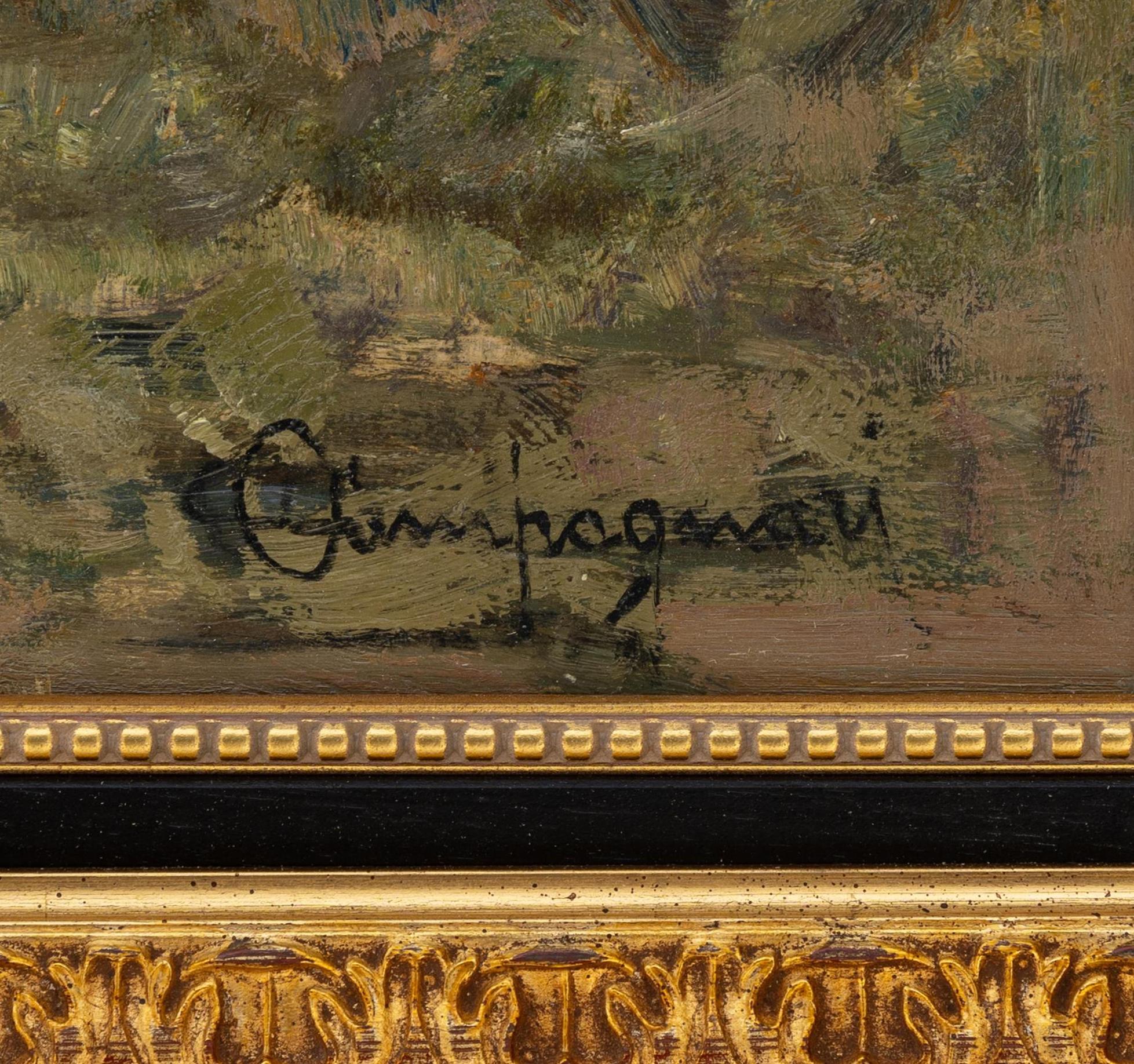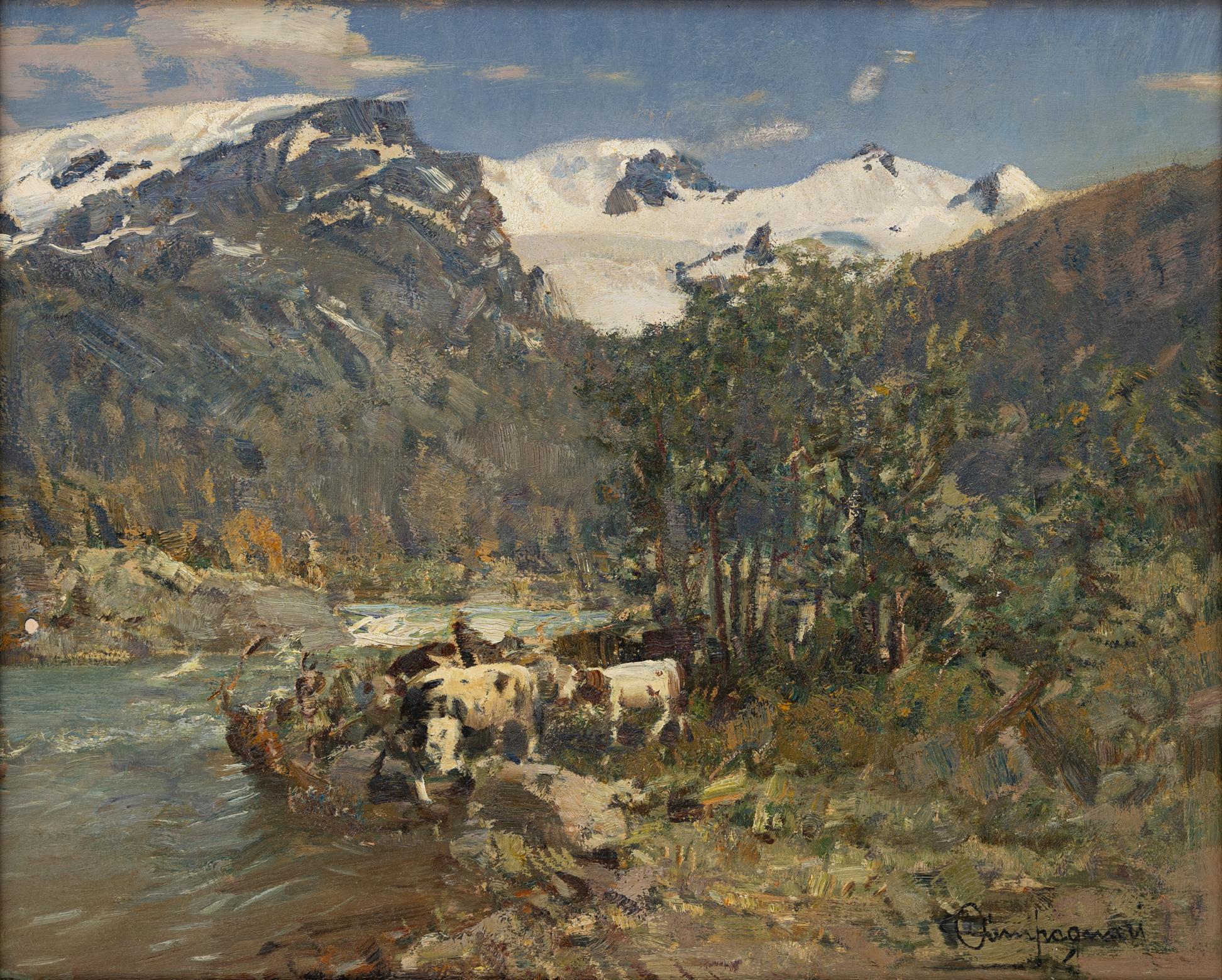 Ottorino Campagnari - Abbeverata nei pressi del Monte Rosa - Mestre 1910 - Torino 1982 - Olio su tavola cm 40x50 - Ottorino Campagnari è stato un illustre artista paesaggista dello stile tardo ottocentesco, la cui carriera artistica ha inizio fin da giovane. Si specializzò nell'affresco di scene montane e nelle vibranti rappresentazioni delle mareggiate lungo la costa ligure, in particolare nelle vicinanze di Varigotti, dove spesso soggiornava per trarre ispirazione.La sua presenza artistica è stata notevole, partecipando a numerose mostre nazionali, tra cui spicca la sua partecipazione alla Promotrice di belle arti di Torino nel 1942. Campagnari ha tenuto sia mostre personali che ha partecipato a esposizioni collettive in Italia e all'estero.Le sue composizioni si caratterizzano per la loro piacevolezza e per la capacità espressiva dell'artista. Questa capacità espressiva è indubbiamente degna di interesse, paragonabile ai suoi paesaggi. È sostenuta da una solida e attenta preparazione artistica, che gli ha permesso in molti casi di catturare in modo straordinario la bellezza e l'autenticità di un paesaggio, spesso accompagnato da figure umane, e il mondo circostante. Questa impostazione artistica è rimasta costante nel tempo, mantenendo la sua struttura e la sua suggestiva adesione alle montagne che erano care ad altri grandi maestri dell'arte come Maggi, Musso, Rolla e Angelo Abrate.È evidente che Campagnari ha mantenuto intatto il suo dialogo con la natura, preservando la genuinità delle sue immagini, la fedeltà all'ambiente e la coerenza nella testimonianza di un dipingere che ha conquistato il pubblico per il suo costante amore per l'antica "veduta" e per il suo sincero intento rappresentativo. La sua raffigurazione è sempre piacevole, pronta a catturare il profondo significato di una tradizione paesaggistica che sembra resistere a ogni cambiamento estetico. Questa tradizione è indissolubilmente legata alla cultura figurativa piemontese dell'Ottocento e del Primo Novecento.Campagnari ha sviluppato una linea espressiva distintiva e inconfondibile, dimostrando una notevole abilità nel rendere con leggerezza e delicatezza il candido manto della neve e nel catturare gli ultimi dettagli di un paesaggio in continua trasformazione con il passare delle stagioni. La sua opera è un tributo duraturo alla bellezza della natura e alla ricca tradizione artistica dell'Ottocento e del primo Novecento, che continua a influenzare e a ispirare gli amanti di un genere pittorico che, pur in un mondo in continua evoluzione, resta un richiamo sentito e rassicurante nelle giornate agitate della nostra esistenza.