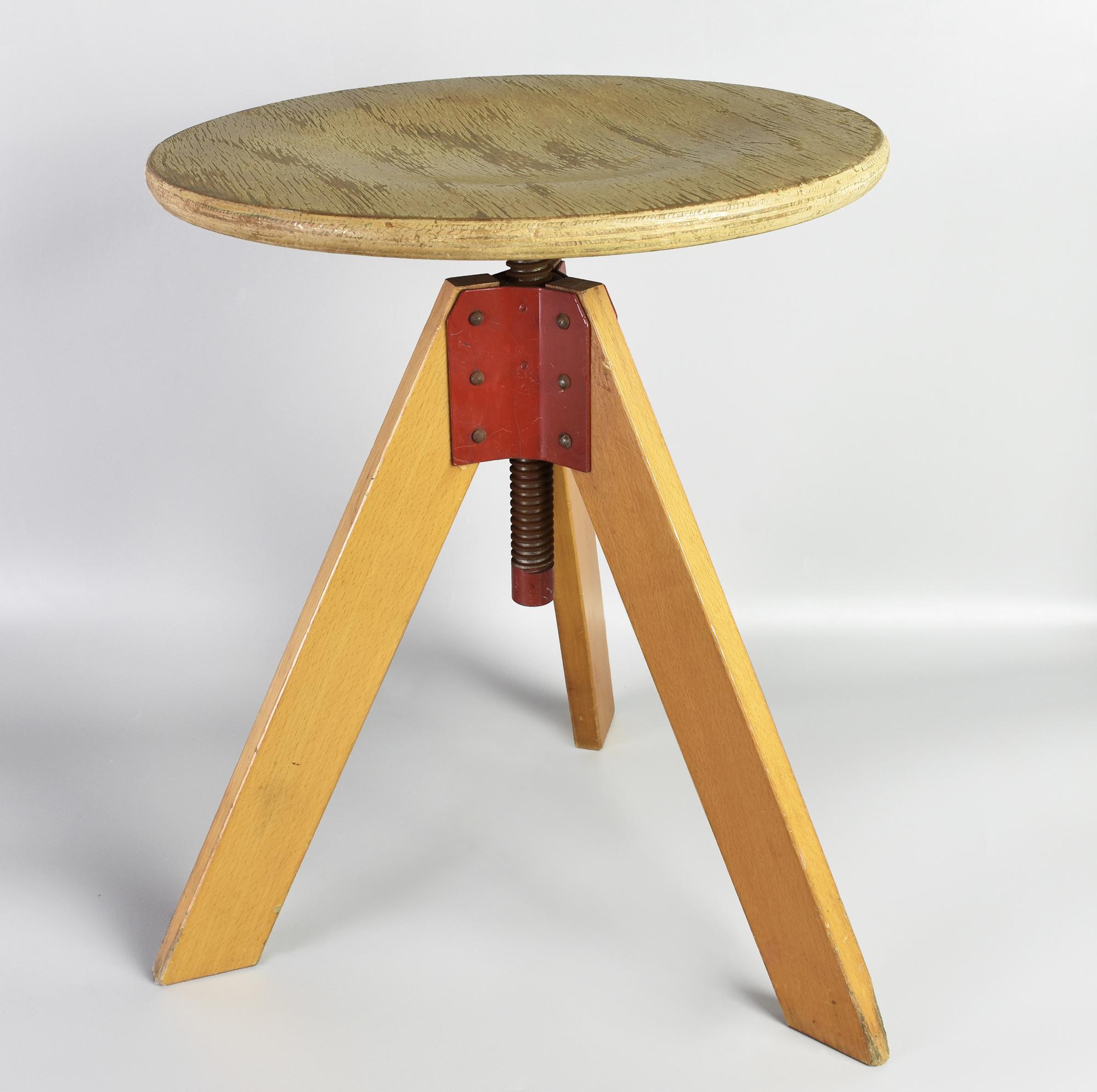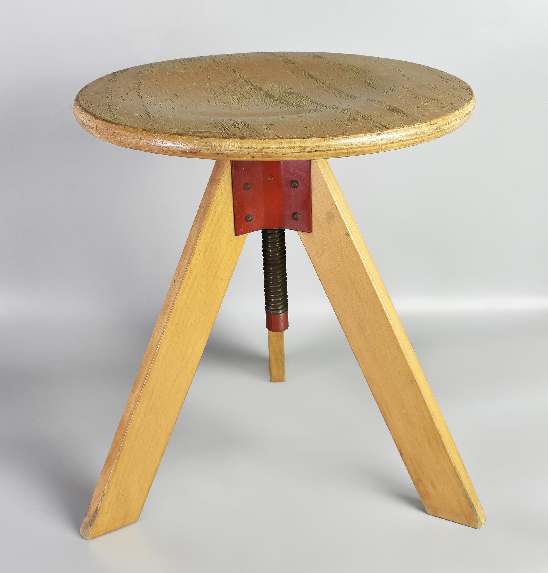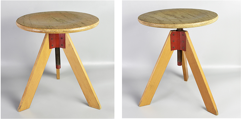 coppia di sgabelli girevoli in faggio con fissaggi in metallo laccato rosso, cm 44-56x45x45