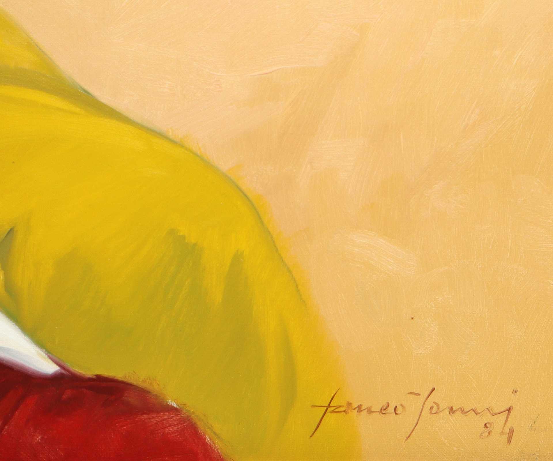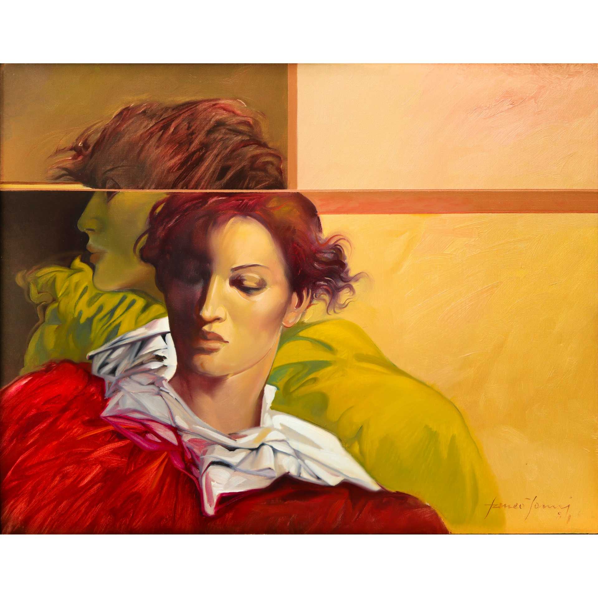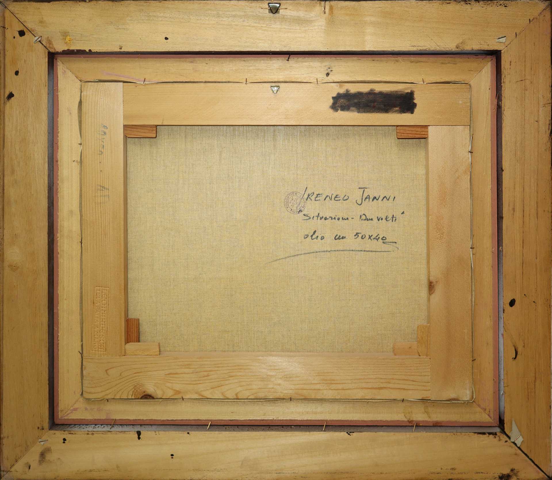 Franco Janni - Donna con doppio volto, 1984 H cm 40x50 - in cornice H cm 61x71 Olio su tela Firmato e datato al fronte in basso a destra. Sul retro firmato, titolato Sitazione - Due volti., timbro Pinacoteca Roma.
