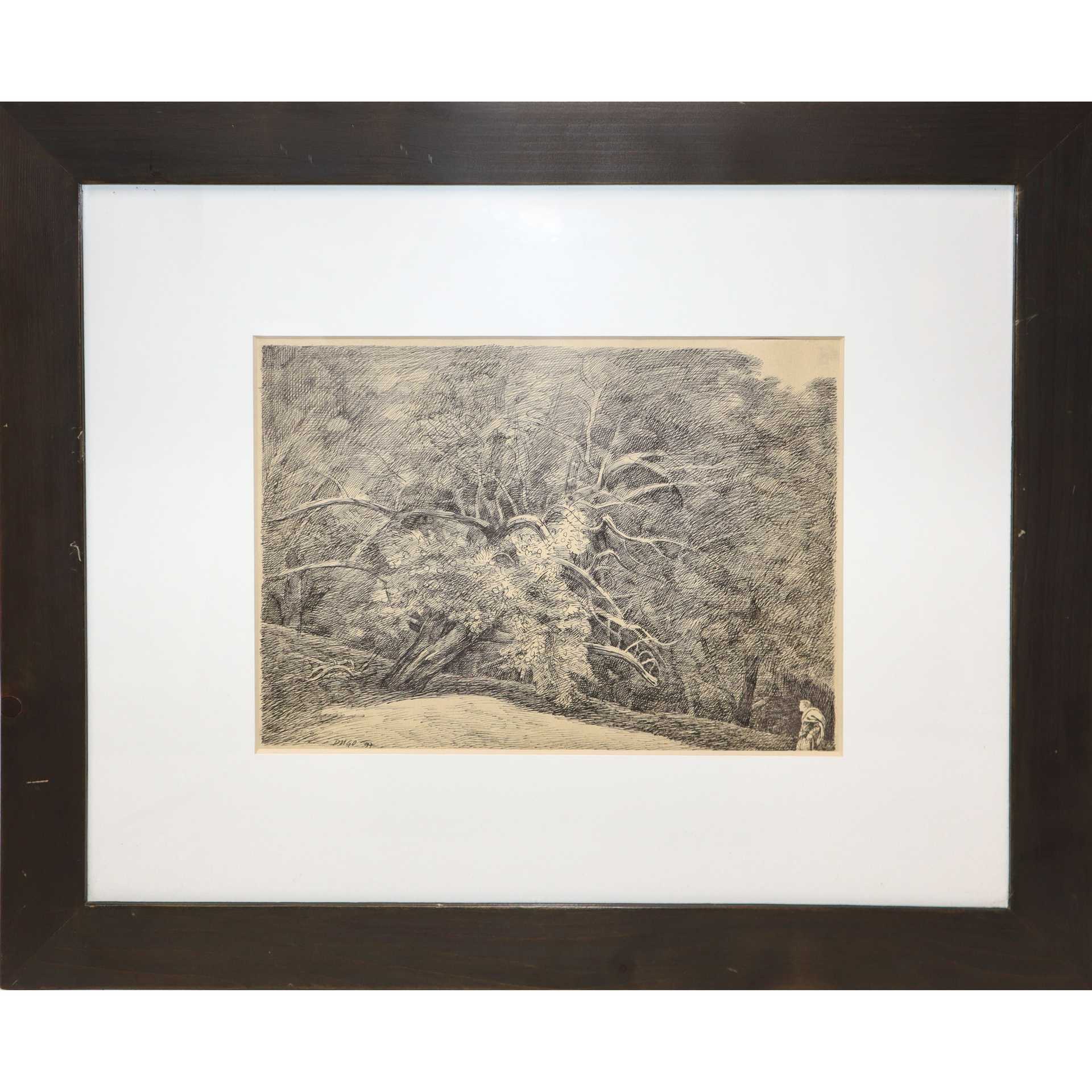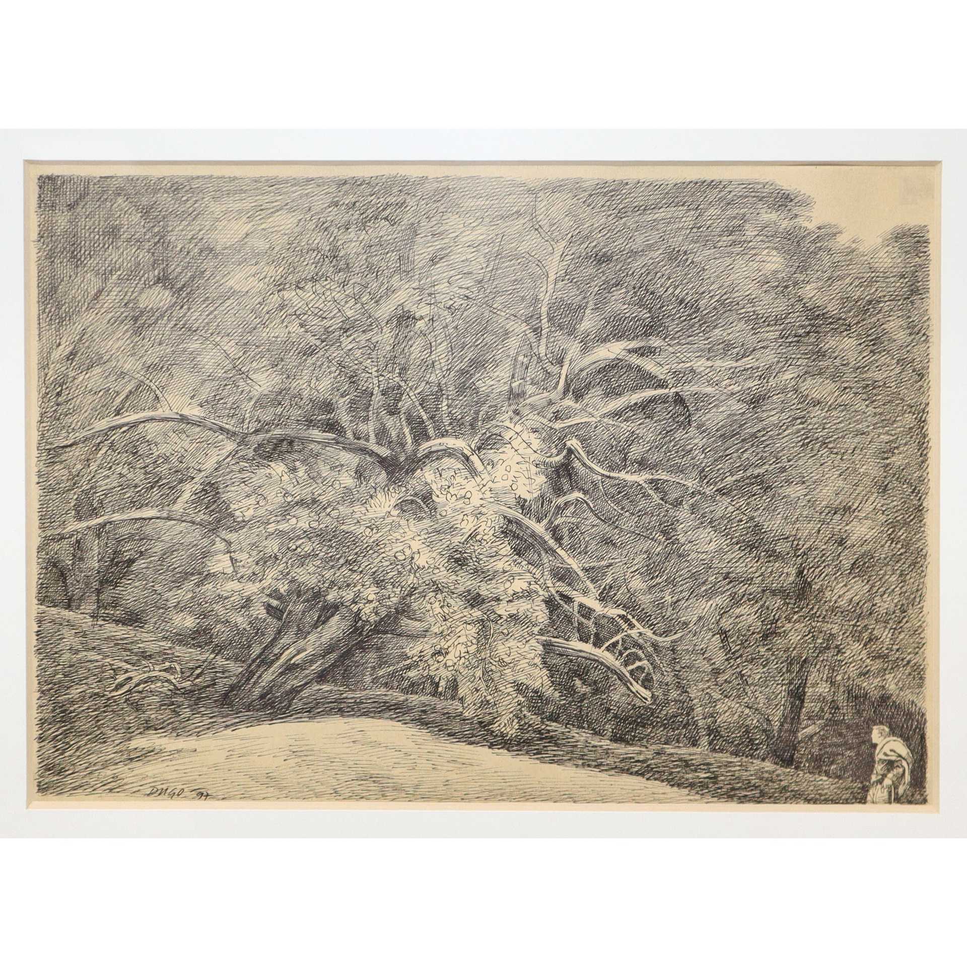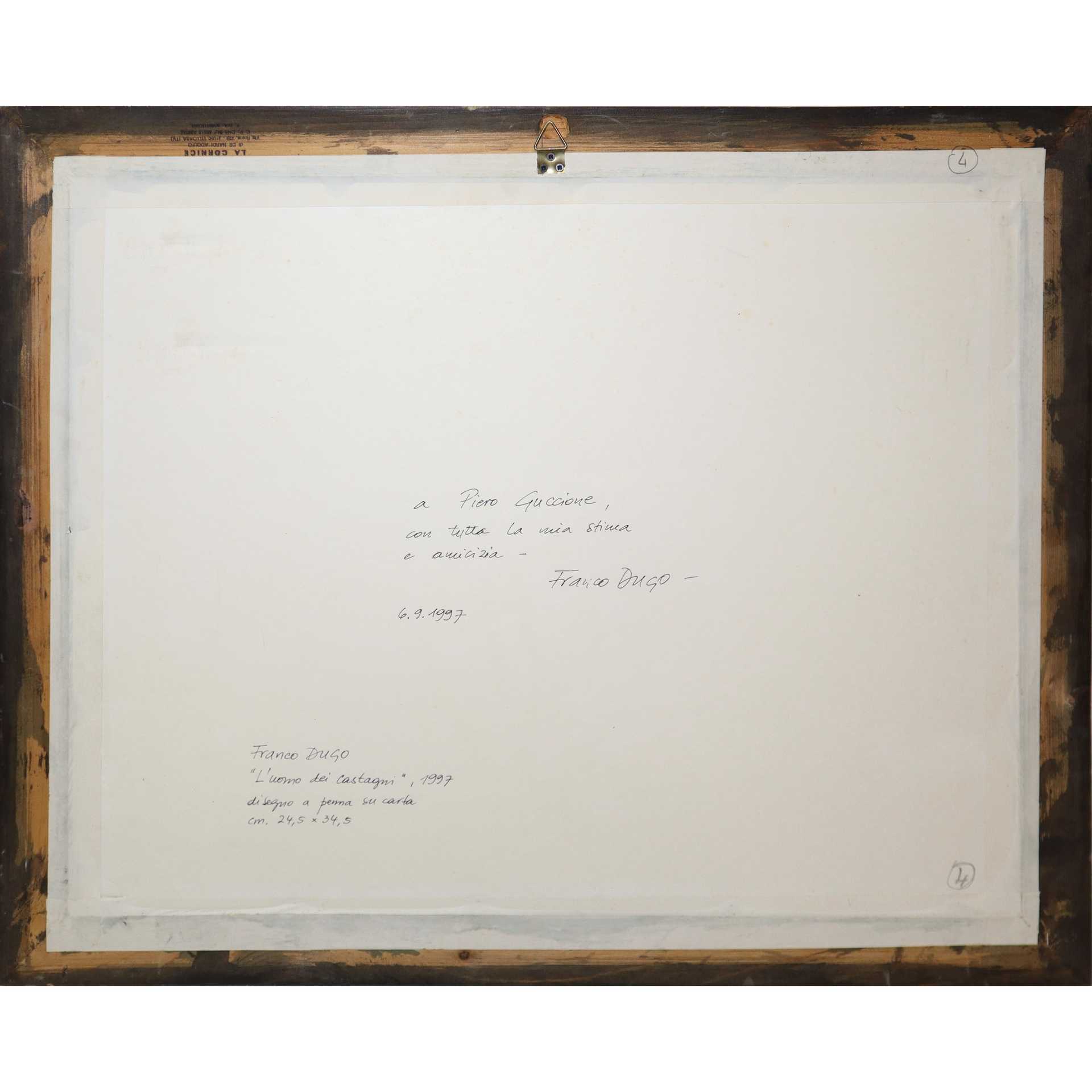 Franco Dugo (1941) - L'uomo dei castagni, 1997 cm 24,5x34,5, in cornice cm 52x64 Disegno a penna su carta Firmato sul fronte in basso a sinistra, titolato, caratteristiche descrittive e dedicato al retro