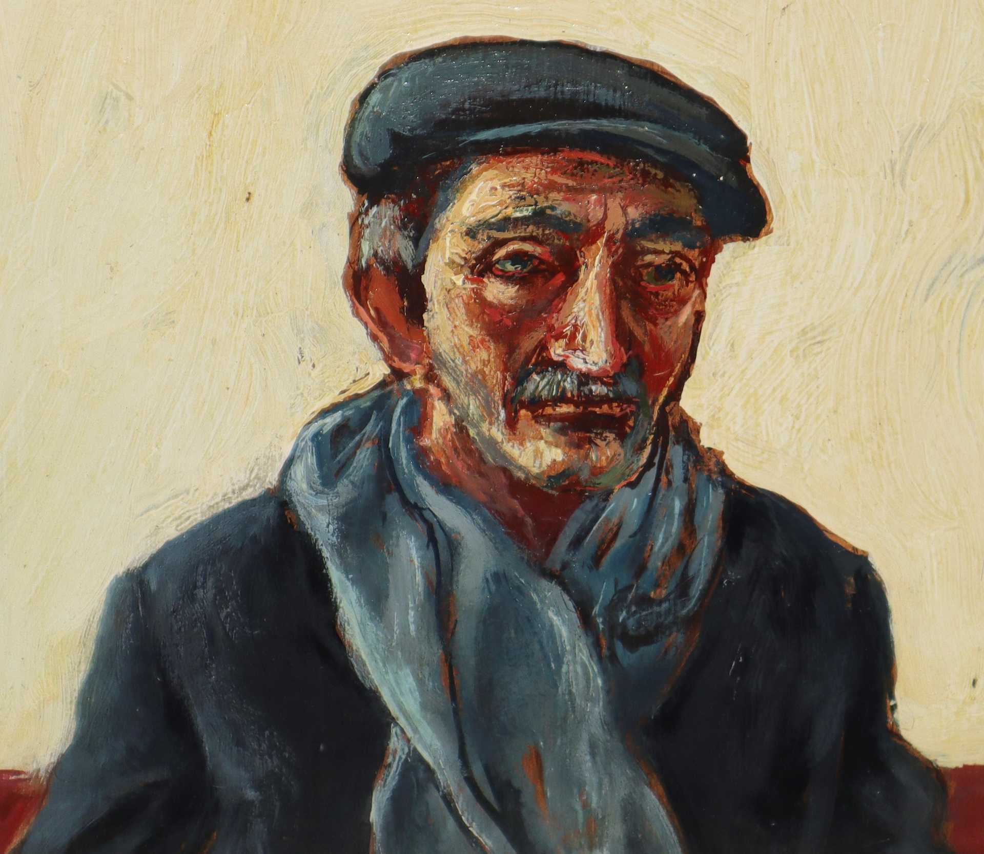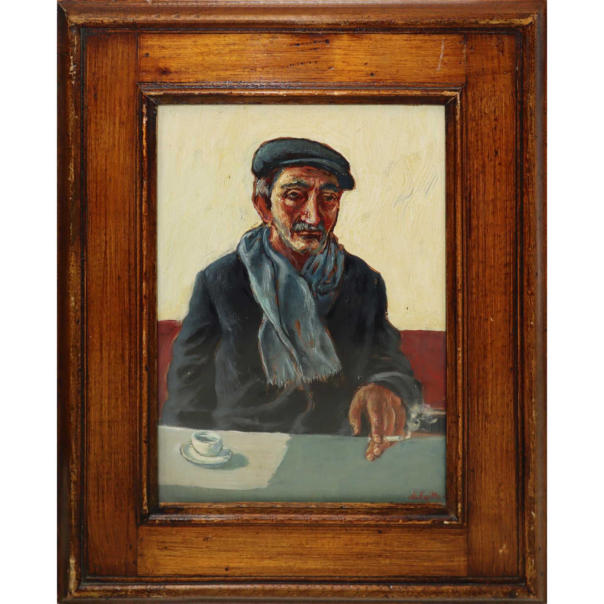 Eligio Egitto (Messina 1933) - Uomo con caffe' e sigaretta H cm 32x23,5 - in cornice H cm 46x37,5 Olio su tavola