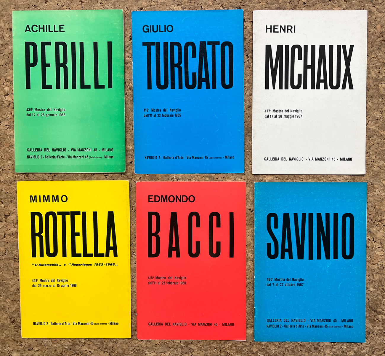 Splendido lotto di numerosi pieghevoli illustrati editi in occasione di storiche esposizioni tenutesi presso Galleria del Naviglio, Milano.