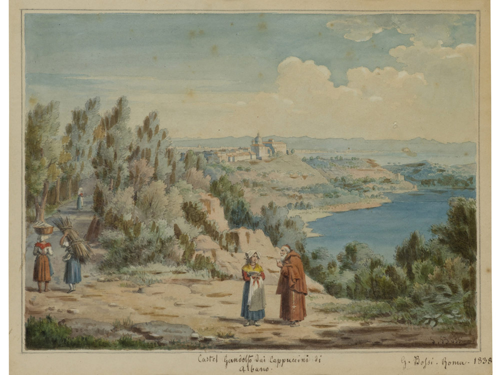 Giuseppe Bossi (Busto Arsizio 1777-Milano 1815) Castel Gandolfo dai Cappuccini di Albano Acquarello su carta Firmato Misure 22x27.5 cm