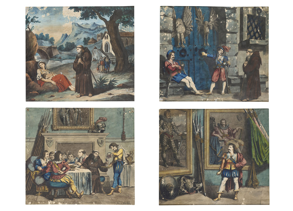 Bartolomeo Pinelli (Roma 1781-1835) Quattro dipinti Scene da I Promessi Sposi Acquarello su carta Firmati Misure 30.5x34 cm