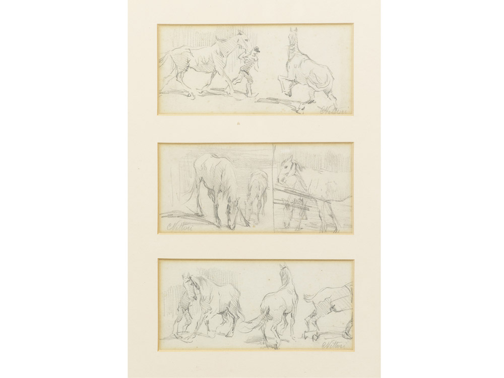 Carlo Vittori (Cremona 1881-1943) Tre bozzetti Scene con cavalli Matita su carta Firmati Misure 7.2x15.8 cm Misure della cornice 41.5x31 cm