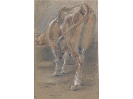 Firma illeggibile (XIX Secolo) Mucca Matita e pastello su carta Firmato...