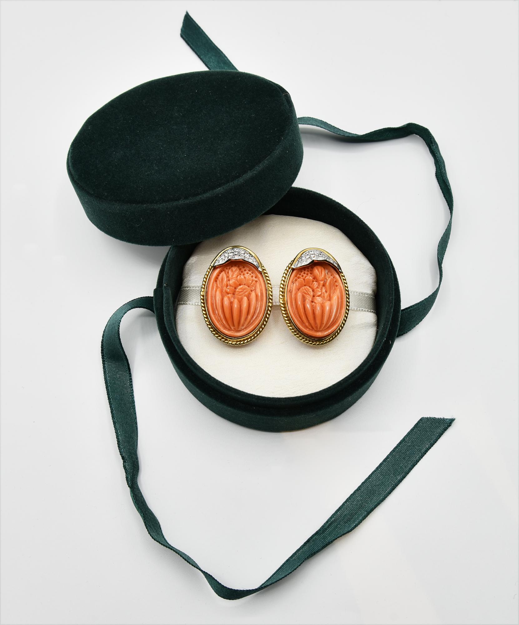 importanti orecchini con corallo intagliato artigianalmente montato su oro giallo, il tutto impreziosito da piccolo pave’ di brillantini per ct 0,78; clip di chiusura in oro bianco