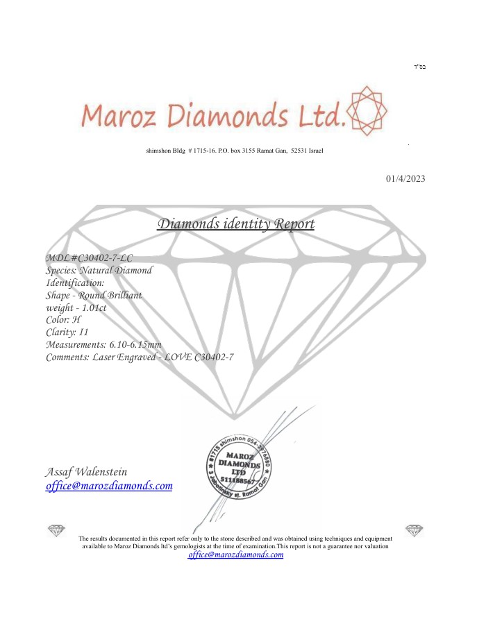 DIAMANTE NATURAL POLISHED 1,01 CARATI H - PUREZZA I1 - TAGLIO BRILLANTE - PUREZZA INCISO AL LASER - CERTIFICATO GEMMOLOGICO MAROZ DIAMONDS LTD MEMBRO ISRAEL DIAMOND EXCHANGE - C30402-7-LC