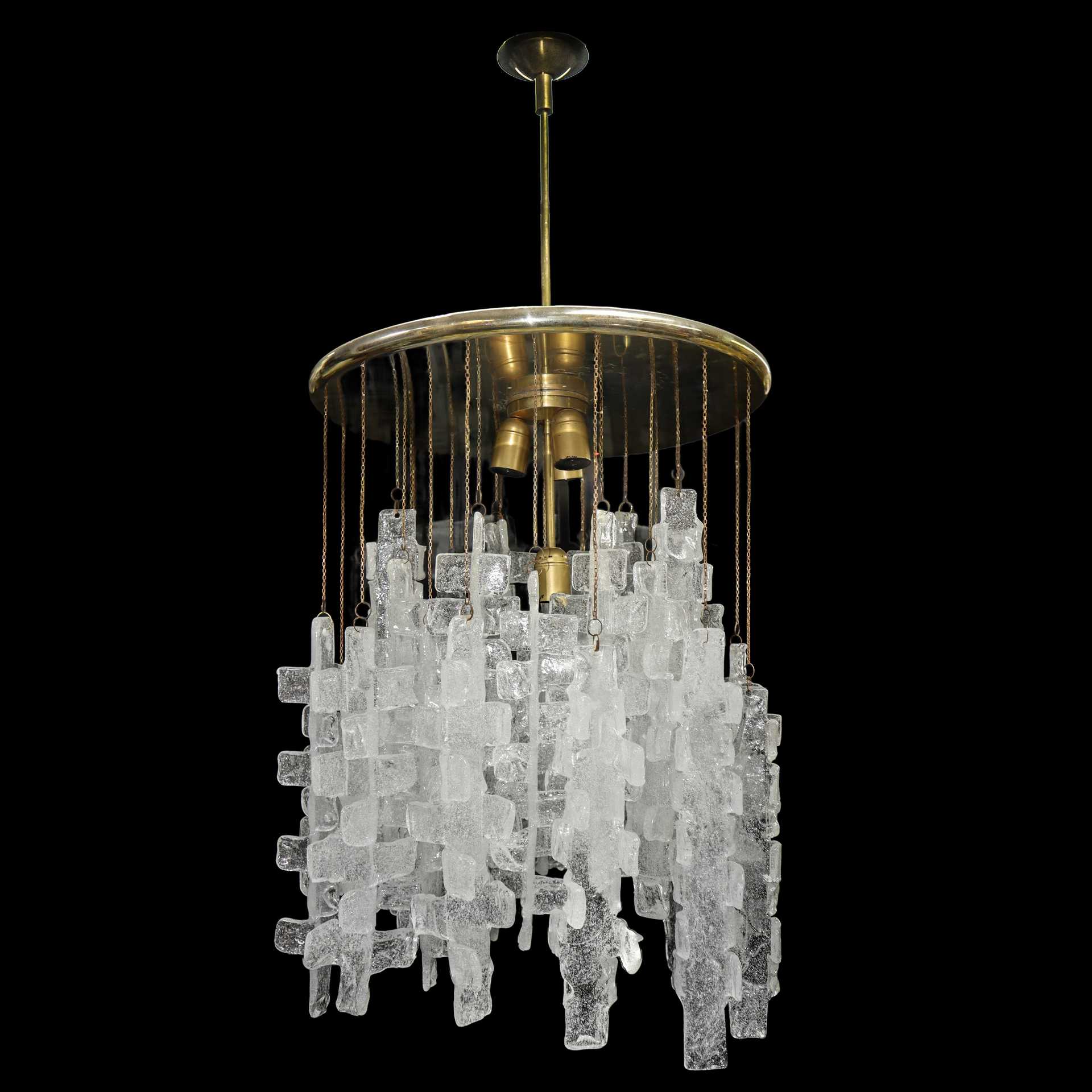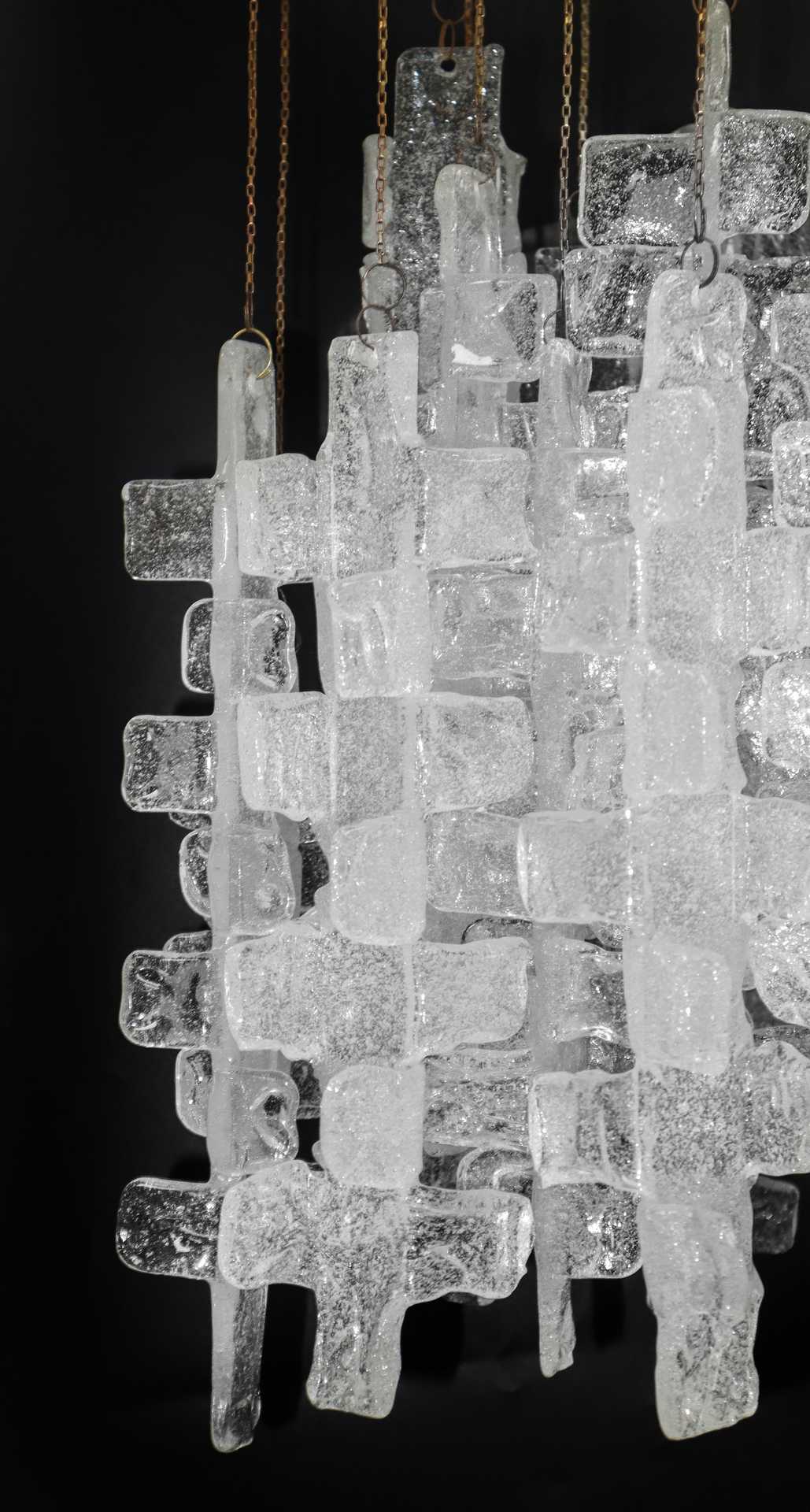 Lampadario in vetro di Murano, nello stile di A.D.Mazzega , 70's H cm 104x53 Con elementi in vetro pulegoso di forma geometrica, struttura in ottone lucido. Con elementi in vetro pulegoso di forma geometrica, struttura in ottone lucido.