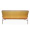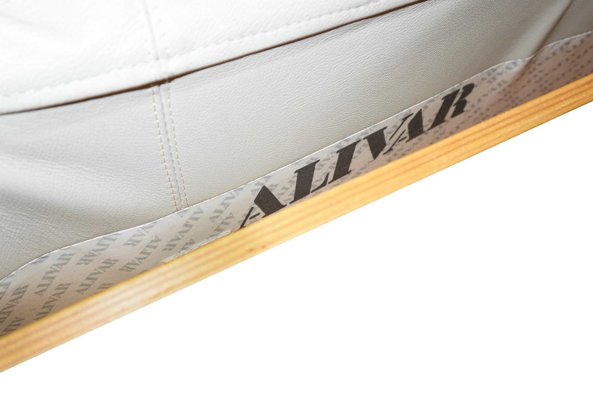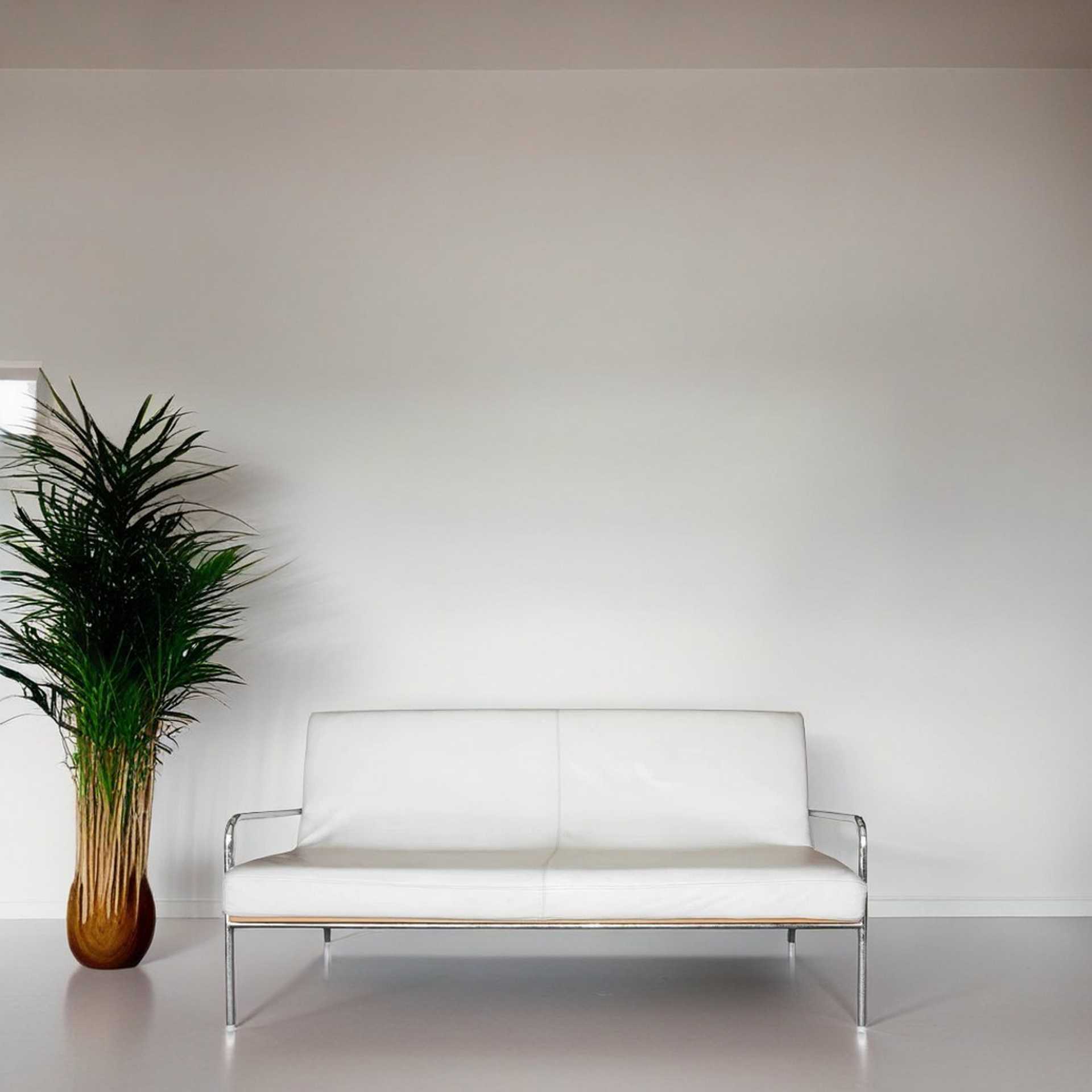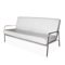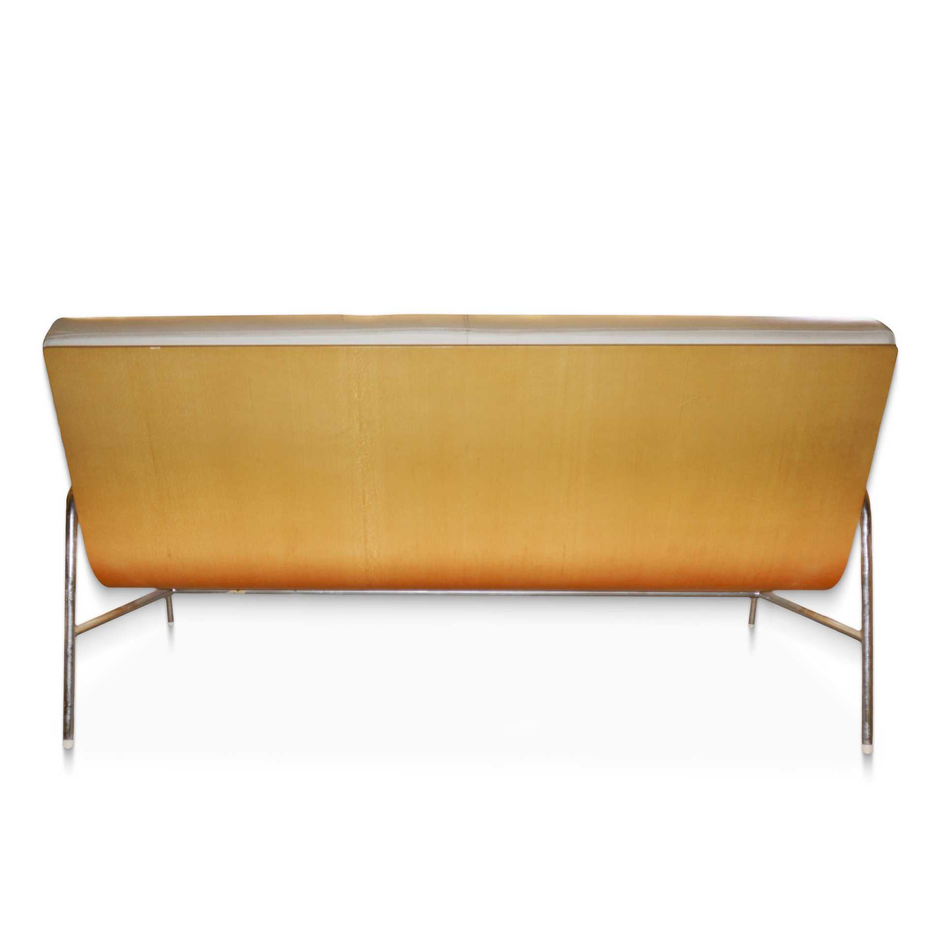 Divano prod. Italiana Alivar con struttura cromata e tappezzeria in pelle bianca e schienale di sostegno in legno chiaro