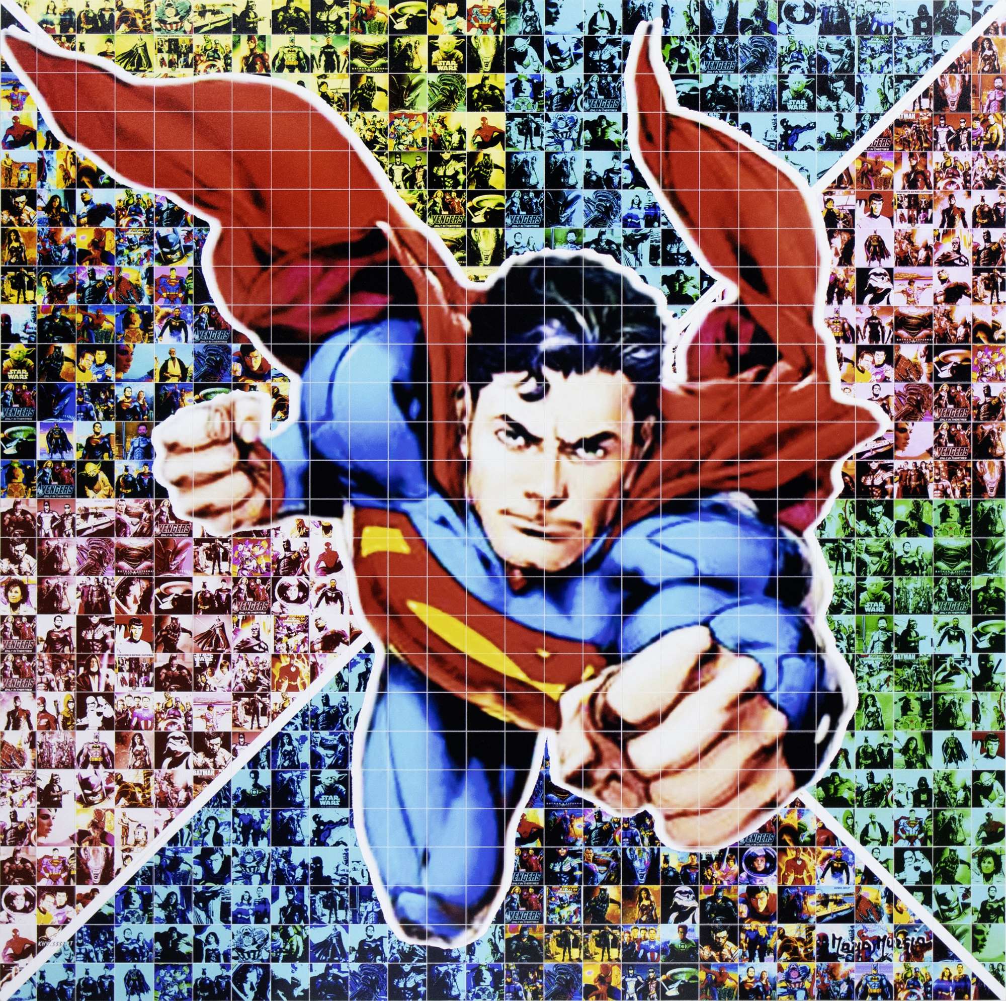 Maria Murgia, Superman, 2024, fotomosaico digitale montato su pannello gatorfoam cm 1,5 intagliato a mano, 70x70 cm, autentica a cura dell'artista, firma presente sul fronte dell'opera