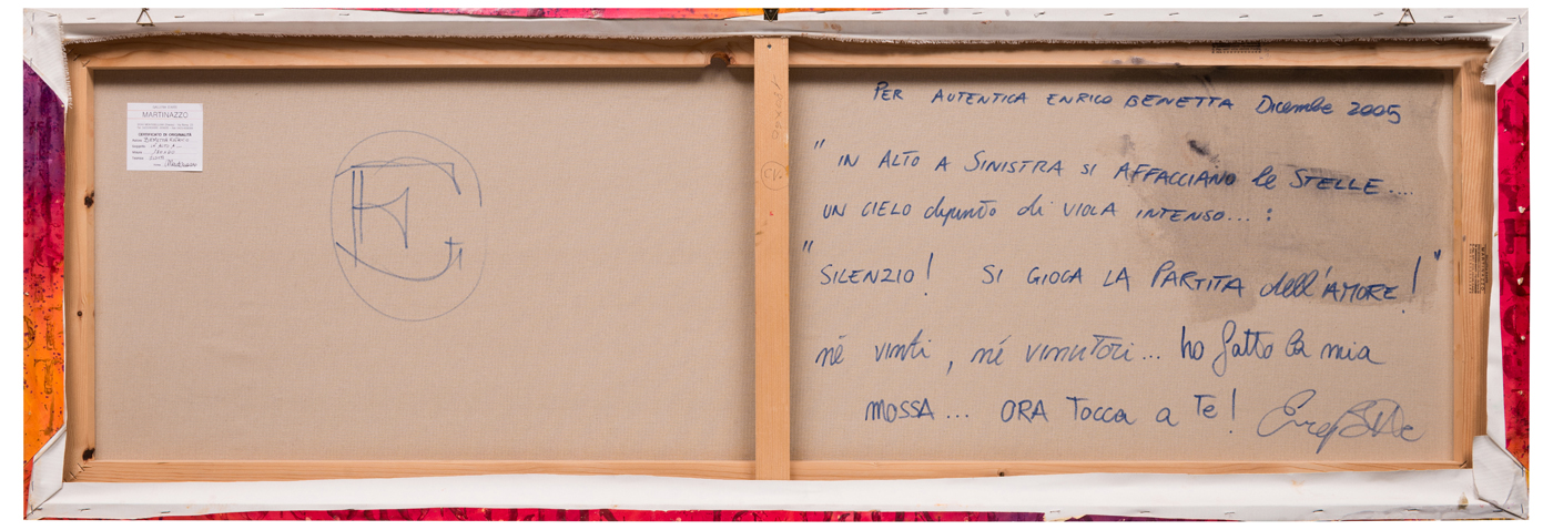 Altre iscrizioni: “In alto a sinistra si affacciano le stelle… un cielo dipinto di viola intenso…: Silenzio! Si gioca la partita dell’amore! Né vinti, né vincitori… ho fatto la mia mossa… ora tocca te!” sul verso