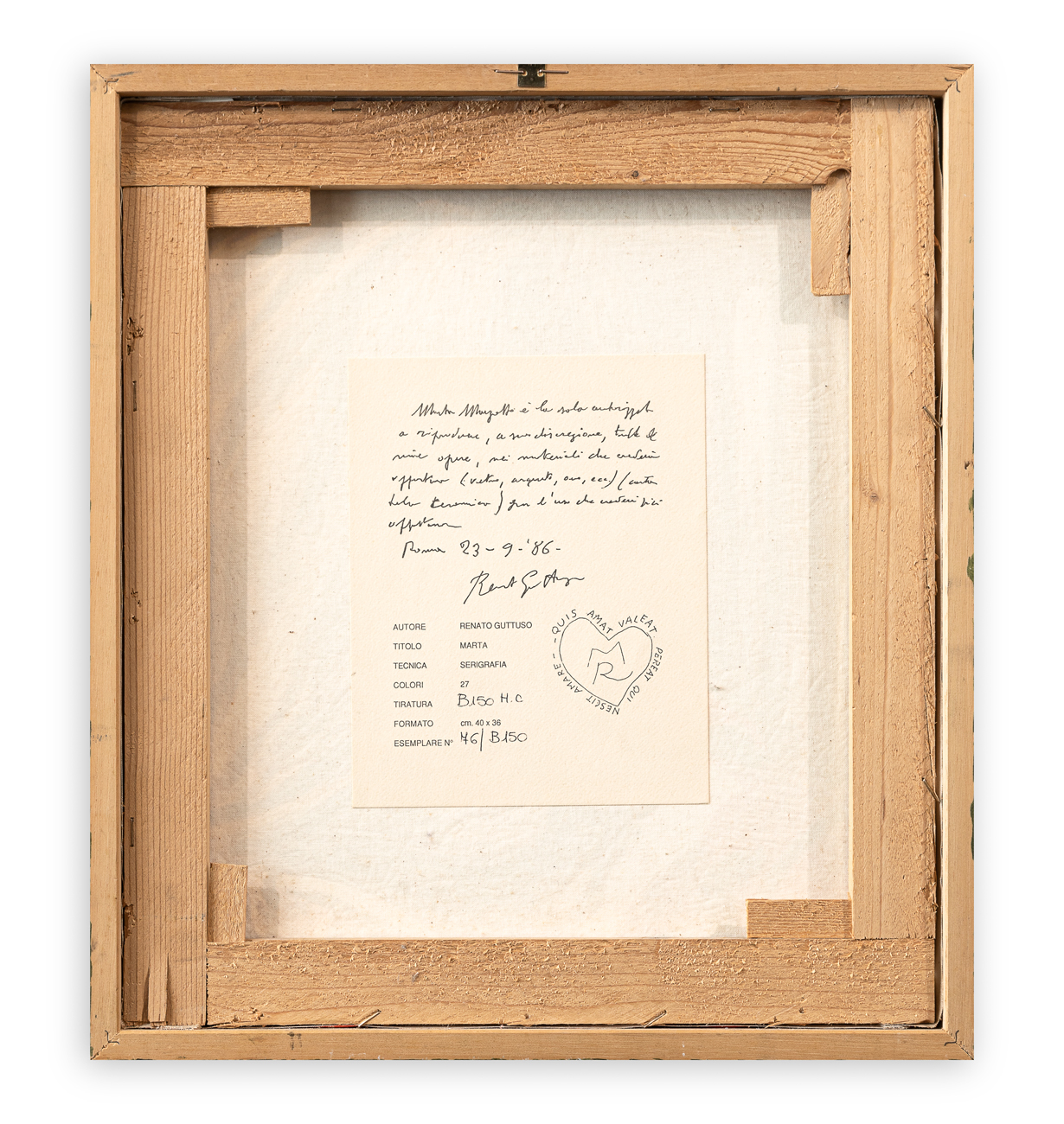 Etichetta con caratteristiche tecniche dell'opera e numerazione (Esemplare 76/B150) al retro